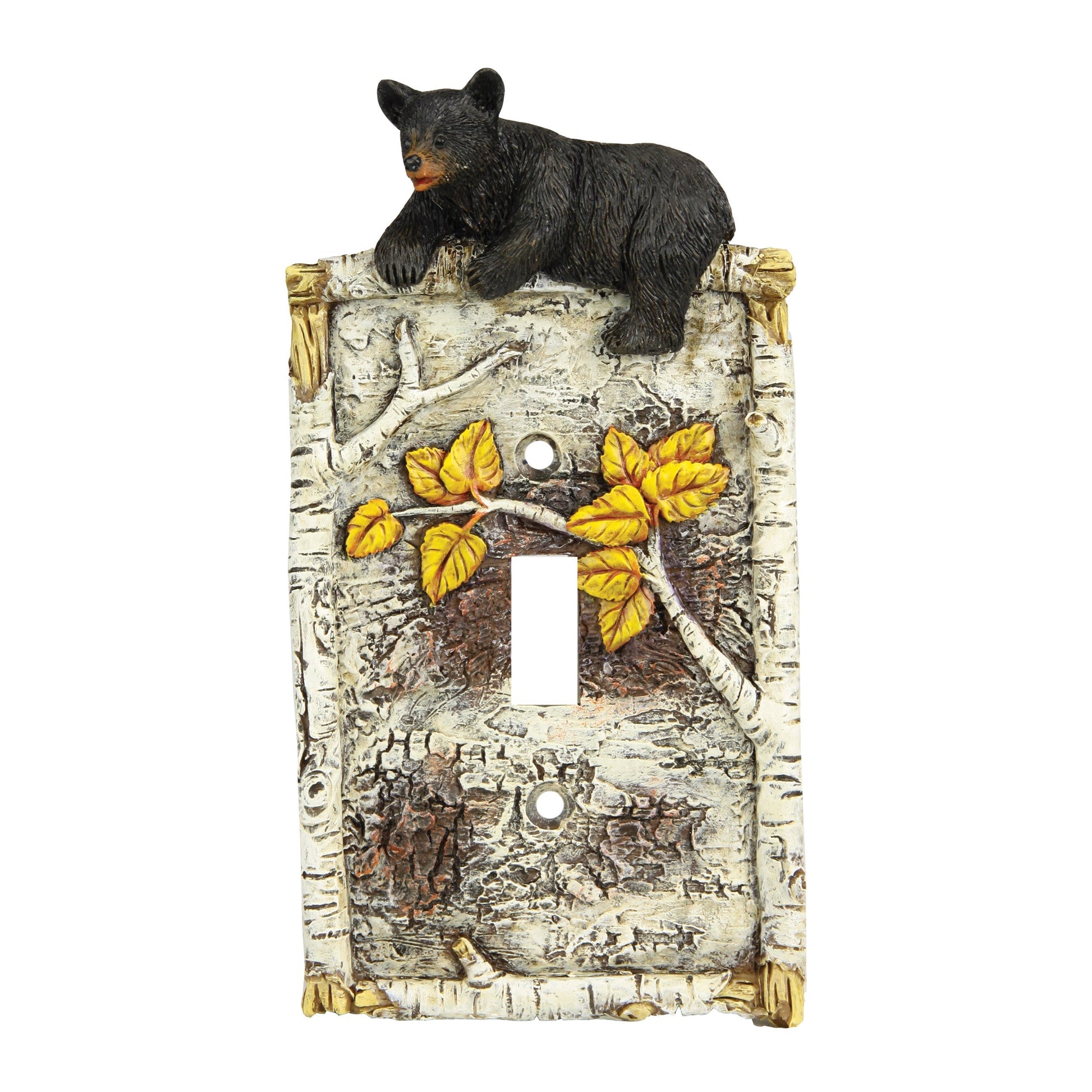This single switch plate cover from Rivers Edge Products is the ideal accent to complement outdoors-themed decor. Features a black bear lounging on top with a birch branch border over a white background with yellow leaves. Match this with our other bears and birch trees wall plate covers to complete your outdoors themed decor.