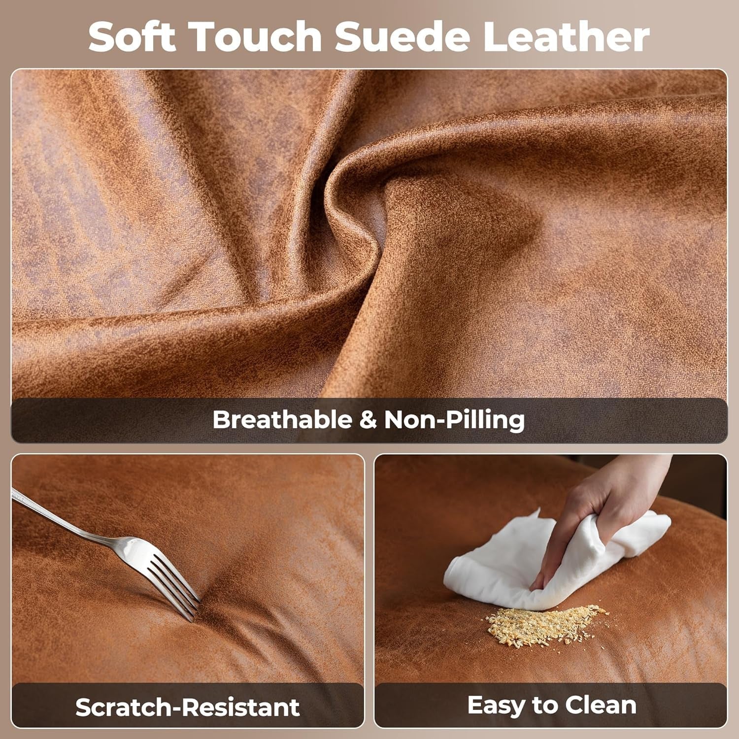 Crafted with premium faux suede leather, it features an ultra-wide seat, a high back, and cotton-filled cushions that offer a soft, cloud-like feel. The breathable, scratch-resistant material maintains its refined look while staying pet-friendly and easy to clean.