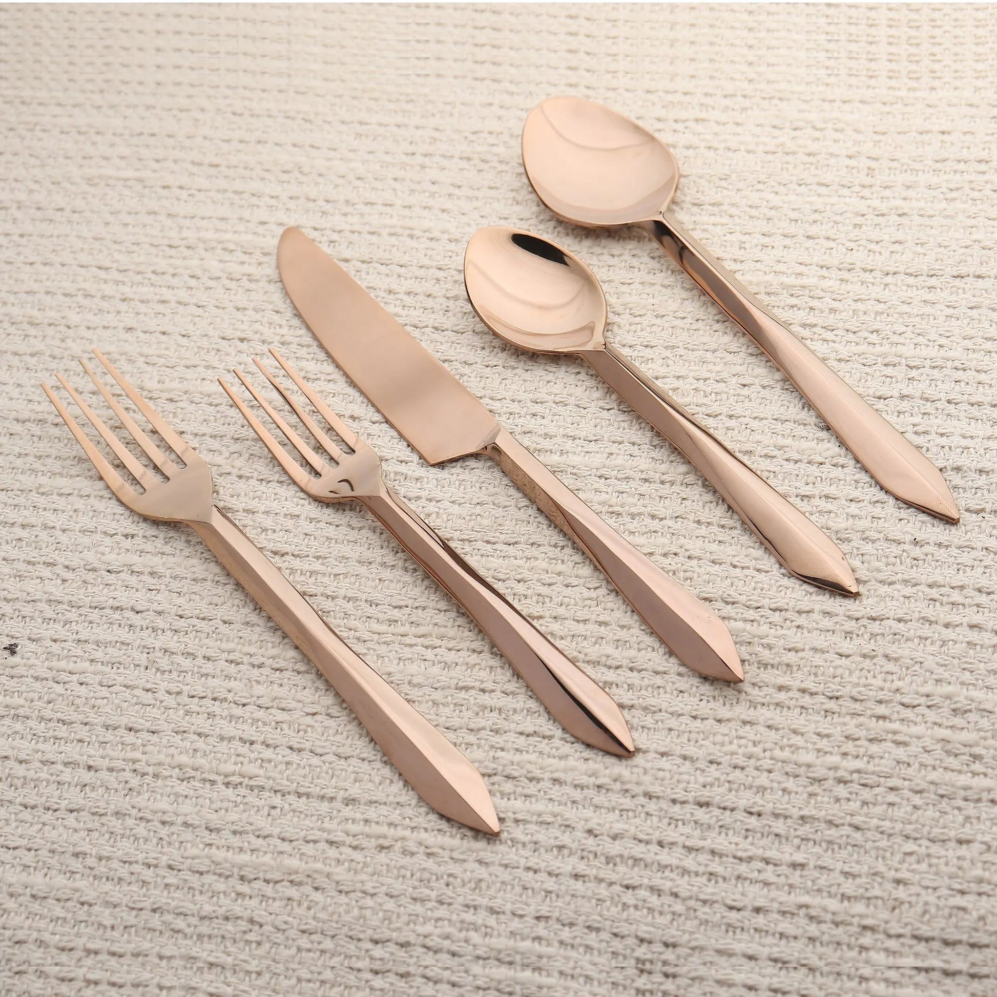 A study in luxury, the Estique PVD Flatware Set captures the essence of modern design with its sleek arrow-like silhouette. The design features a sharp center fold and faceted sides, with a statement-making point at the base. Crafted from high-grade stainless steel and finished in a rich PVD color coating, this unique flatware set will add style to any dinner set. Create unforgettable dining experiences with the Estique PVD flatware collection.