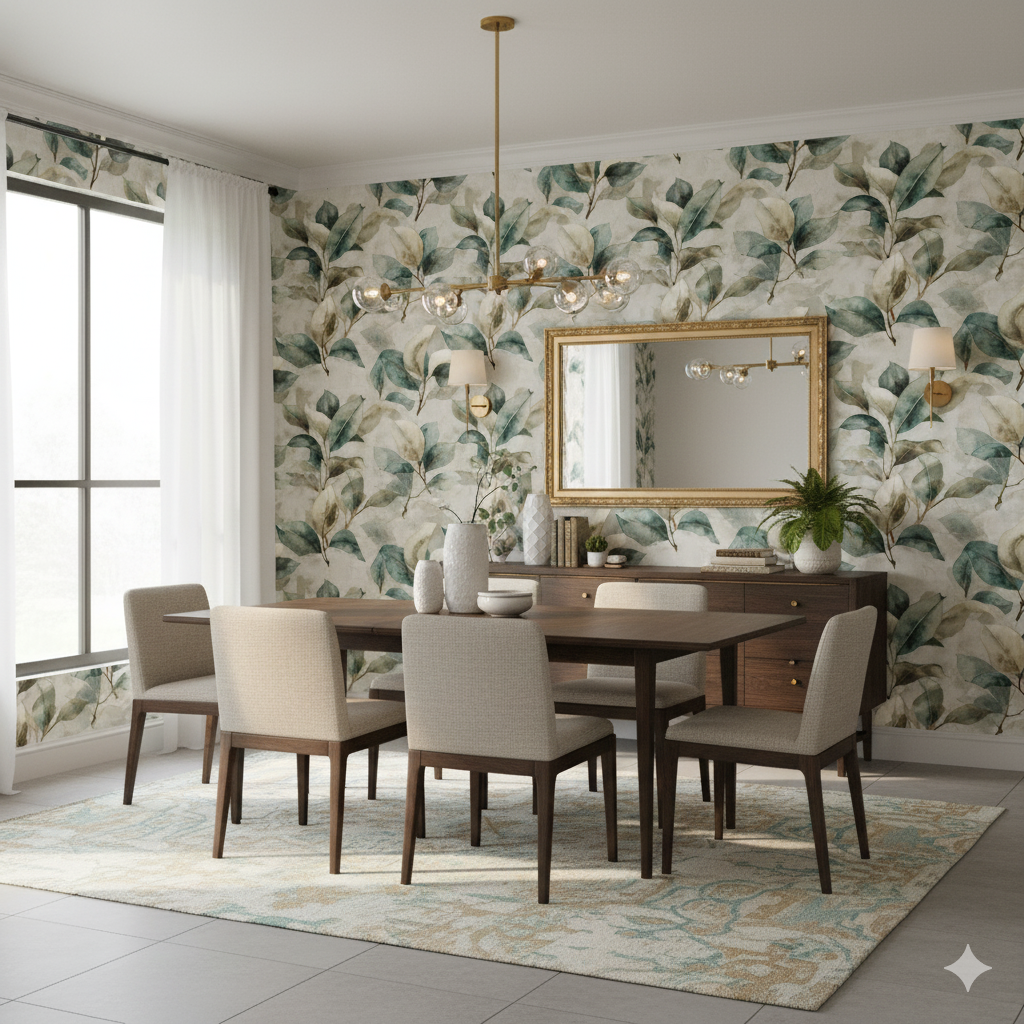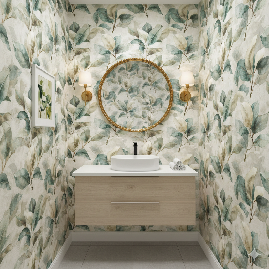 Soft watercolor leaves in muted sage, teal, and parchment hues drift across a pale ground, creating the illusion of a delicate botanical mural. The translucency of the layered foliage feels light and painterly, like observing leaves through sunlight on a breezy day. This wallpaper thrives in living rooms, sunrooms, or spa-like bathrooms where serenity is paramount. It pairs well with rattan, soft linen upholstery, and warm neutrals, enhancing spaces that want both freshness and timeless calm. Though botanical at heart, its washed, painterly quality gives it a modern sophistication far beyond simple floral prints.