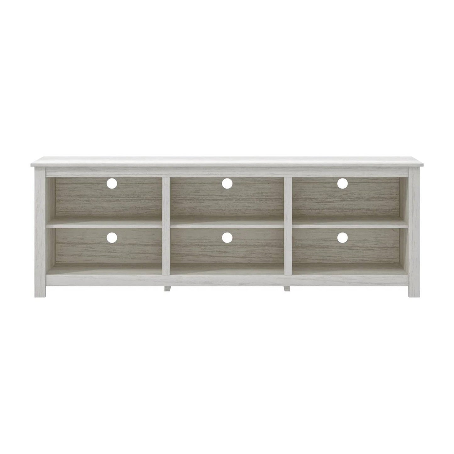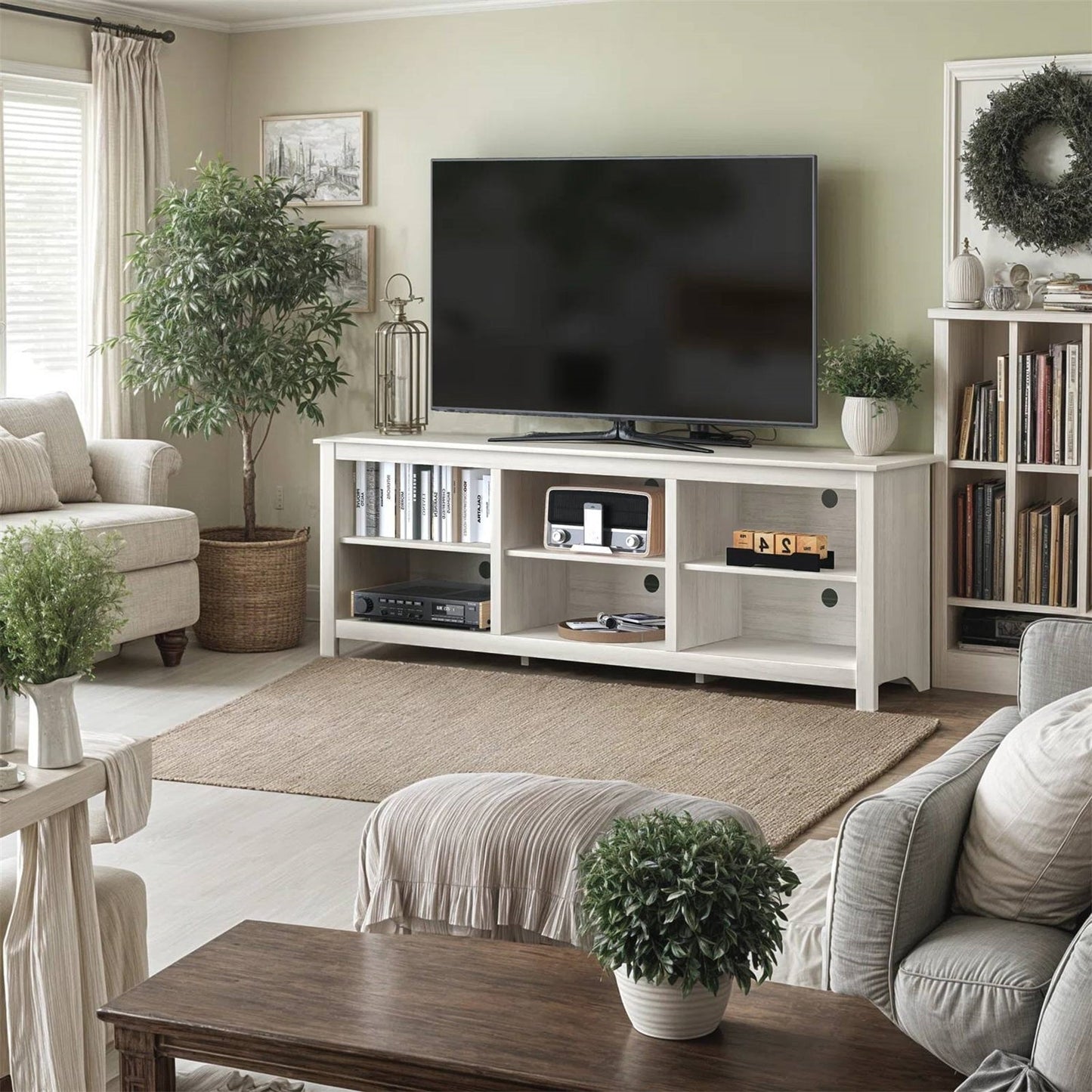 This Farmhouse TV Stand in White Wood Grain Finish - for TVs up to 70-inch offers a stylish and practical solution for your living room or den. Designed to accommodate TVs up to 70", it's crafted from engineered wood, offering a range of color options to fit your decor. With six open compartments, you can display your favorite books and decor items while keeping everything organized. The single cabinet with three interior shelves provides additional storage for media devices or games. Plus, the cable management system helps keep your space tidy by corralling those pesky wires. The natural venting ensures your electronics stay cool, making this stand a functional centerpiece for your entertainment area.