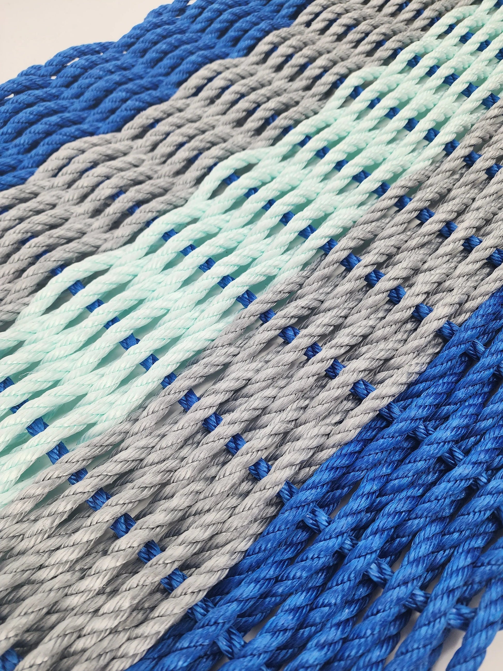 Five Stripe Rope Mat made with Lobster Rope, Blue Gray and Seafoam