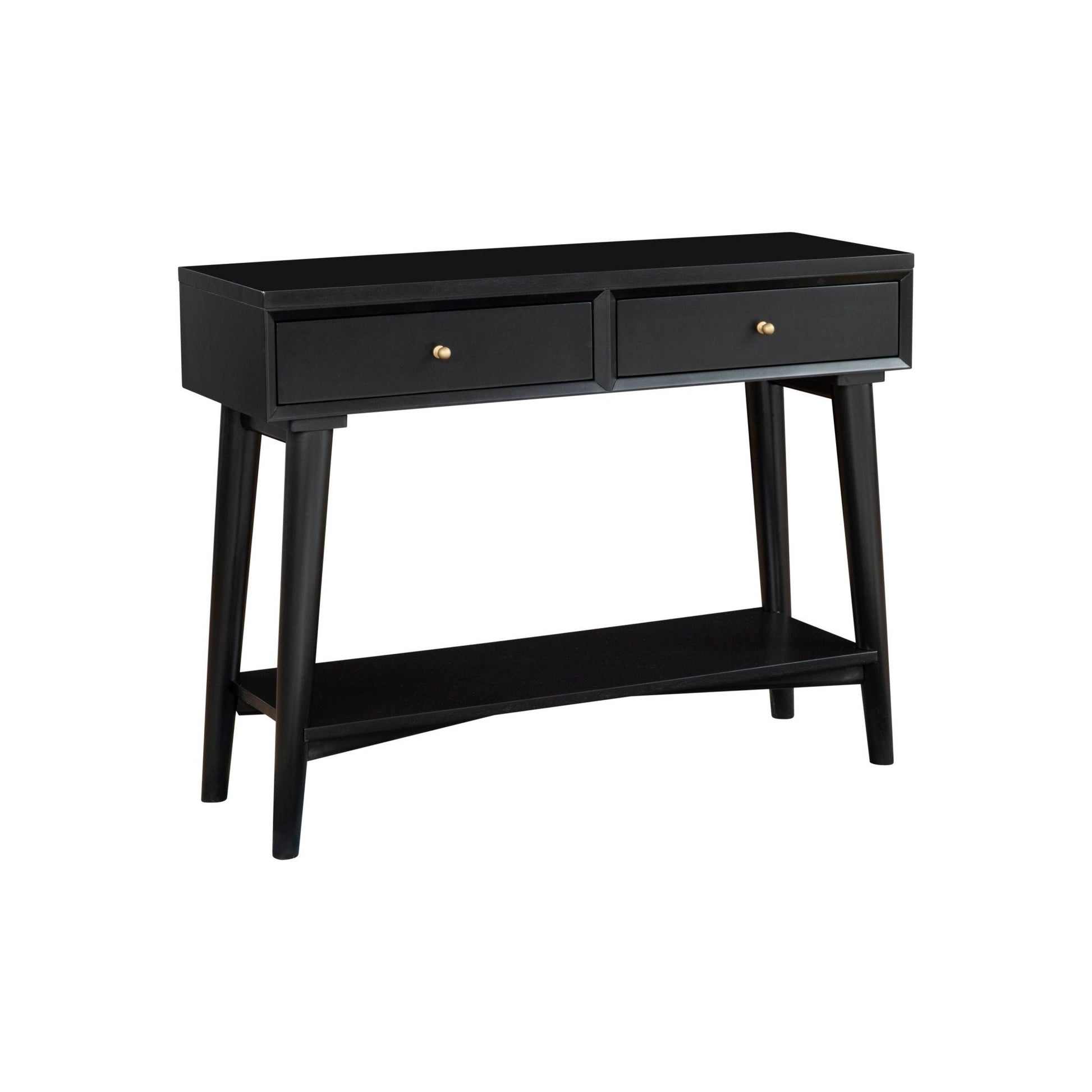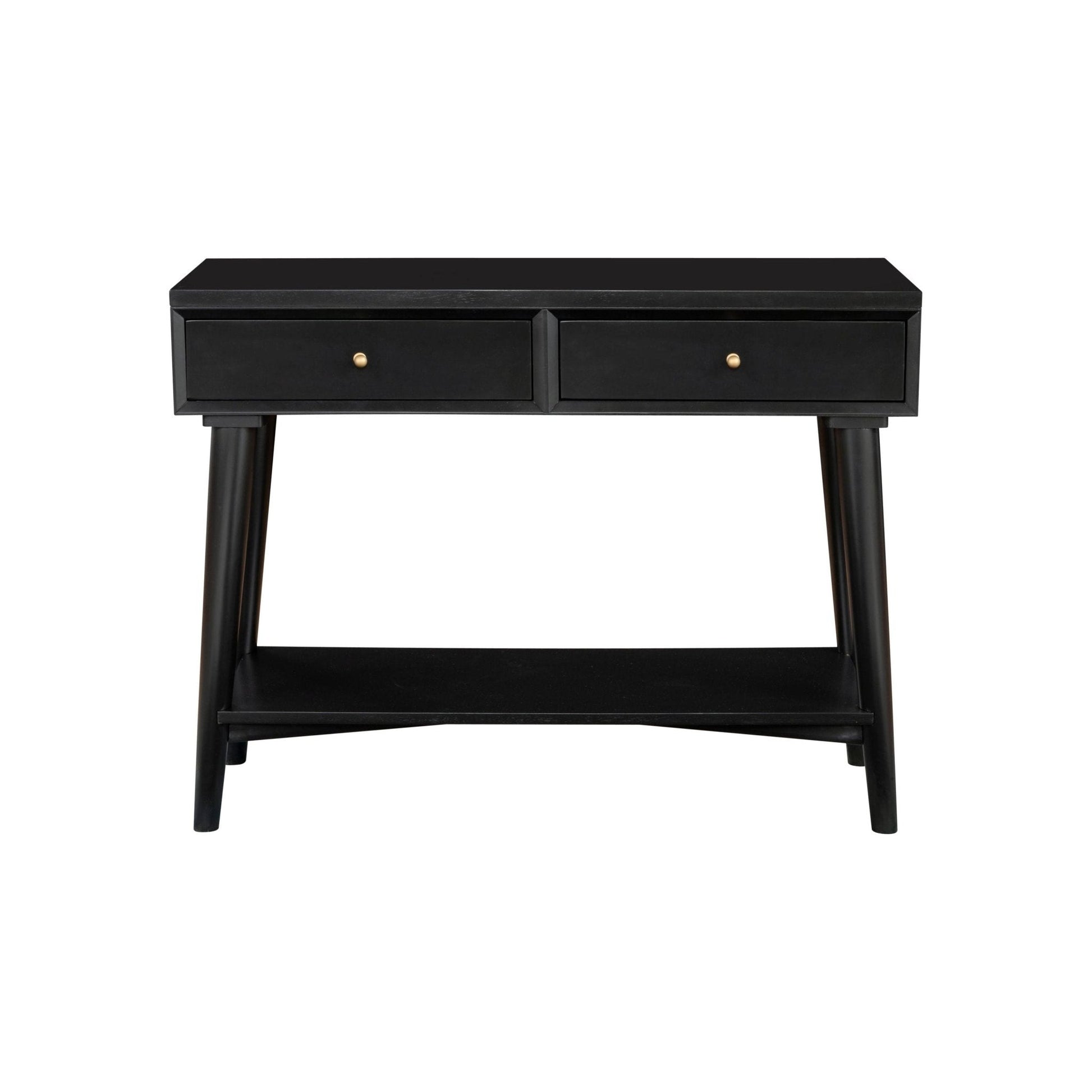 Streamlined and modern, the Flynn console table updates the aesthetic of your home. Mahogany wood solids and Okume veneer are finished in a timeless black finish and blend effortlessly with your color scheme. This piece features flared legs, accent hardware, and 2 felt-lined drawers. Mix and match with other pieces from the Alpine Furniture Flynn collection.