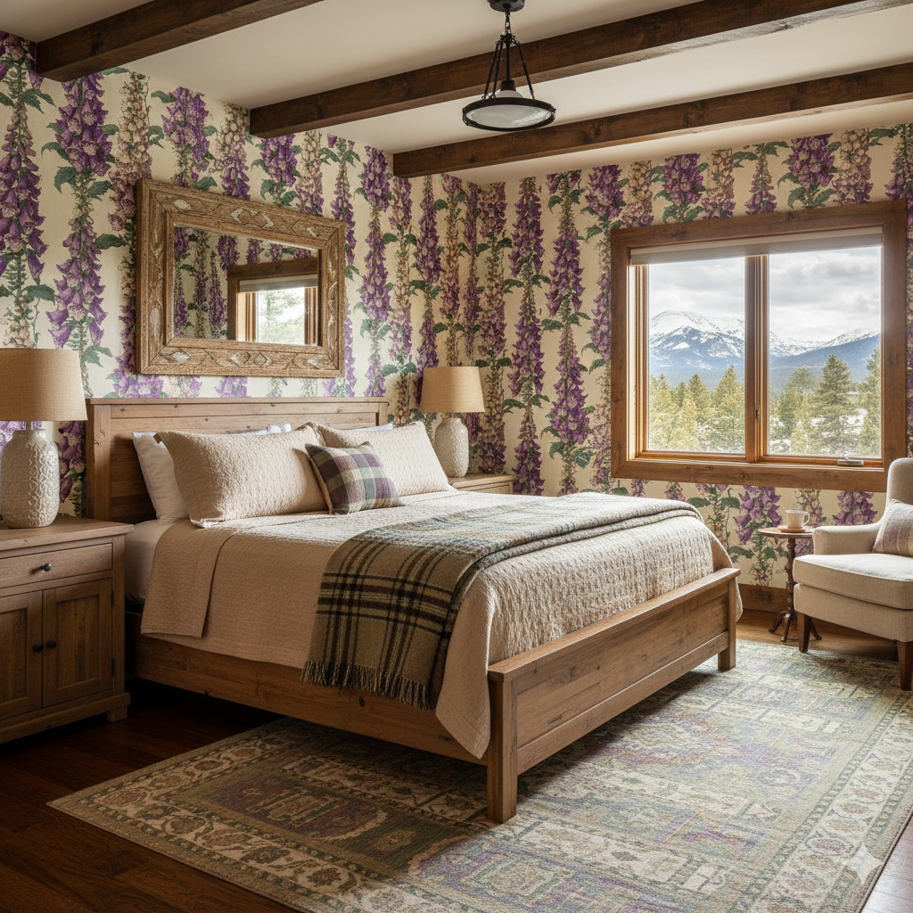 This wallpaper features towering foxglove spires in shades of rich violet and cream, their bell-shaped blossoms stacked like a vertical chorus line of wildflowers. Each bloom is intricately detailed with speckled interiors and fine linework that captures the natural drama of Digitalis purpurea in full bloom. The design balances botanical illustration precision with painterly warmth, set against a soft ivory background that highlights the saturated purples and cool green leaves. Ideal for homeowners seeking floral statement wallpaper, Foxfire Choir transforms dining rooms, entryways, or sunrooms into immersive garden spaces. Its vertical rhythm also makes it an excellent choice for accent walls where height and structure are emphasized, pairing beautifully with both antique furnishings and modern interiors.