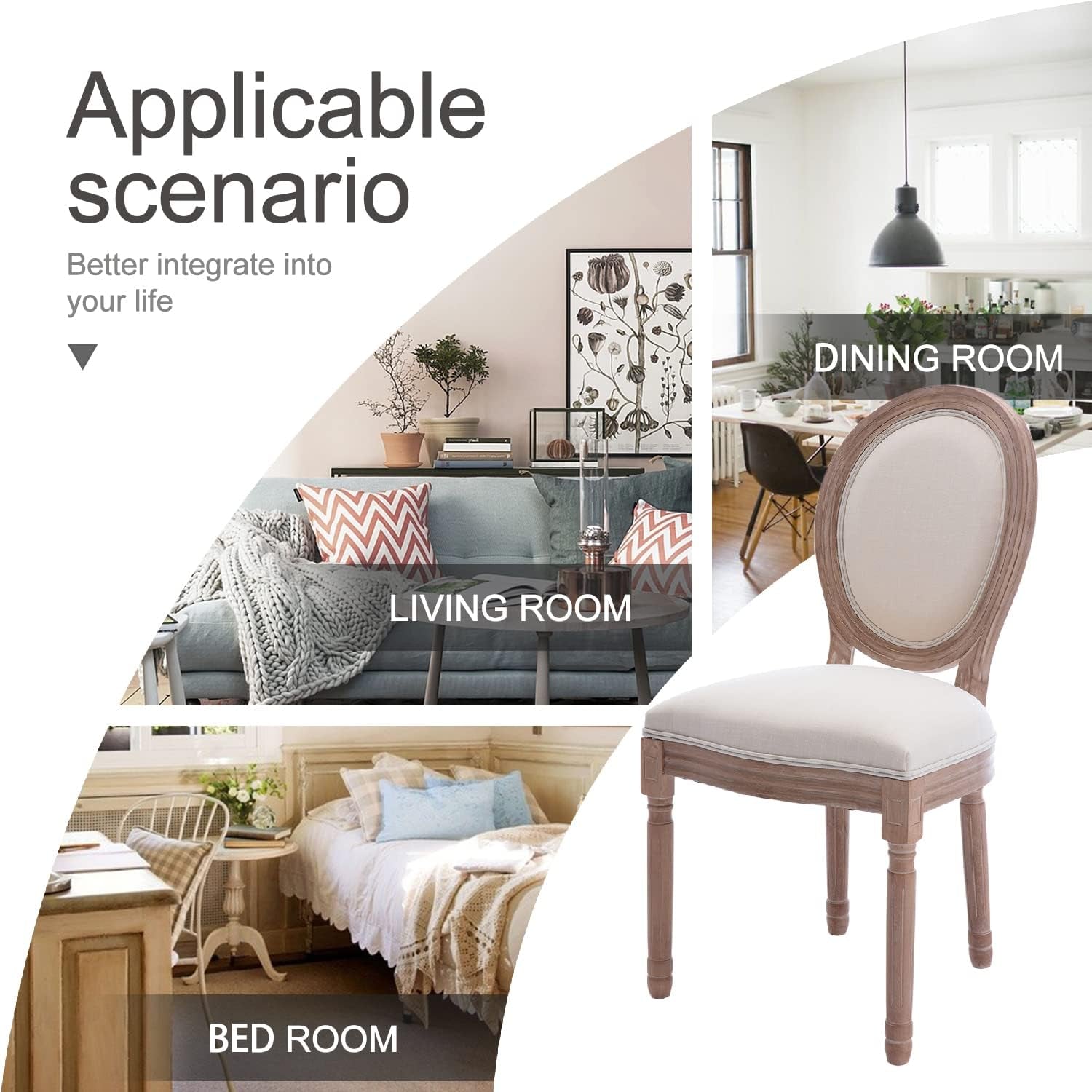 The curved backrests, carved solid wood frames, and tufted fabric seats blend classic elegance with everyday practicality. An antique-inspired rubber wood frame paired with neutral, softly padded cushions creates a refined rustic atmosphere that fits beautifully with traditional, farmhouse, or cottage-style interiors.