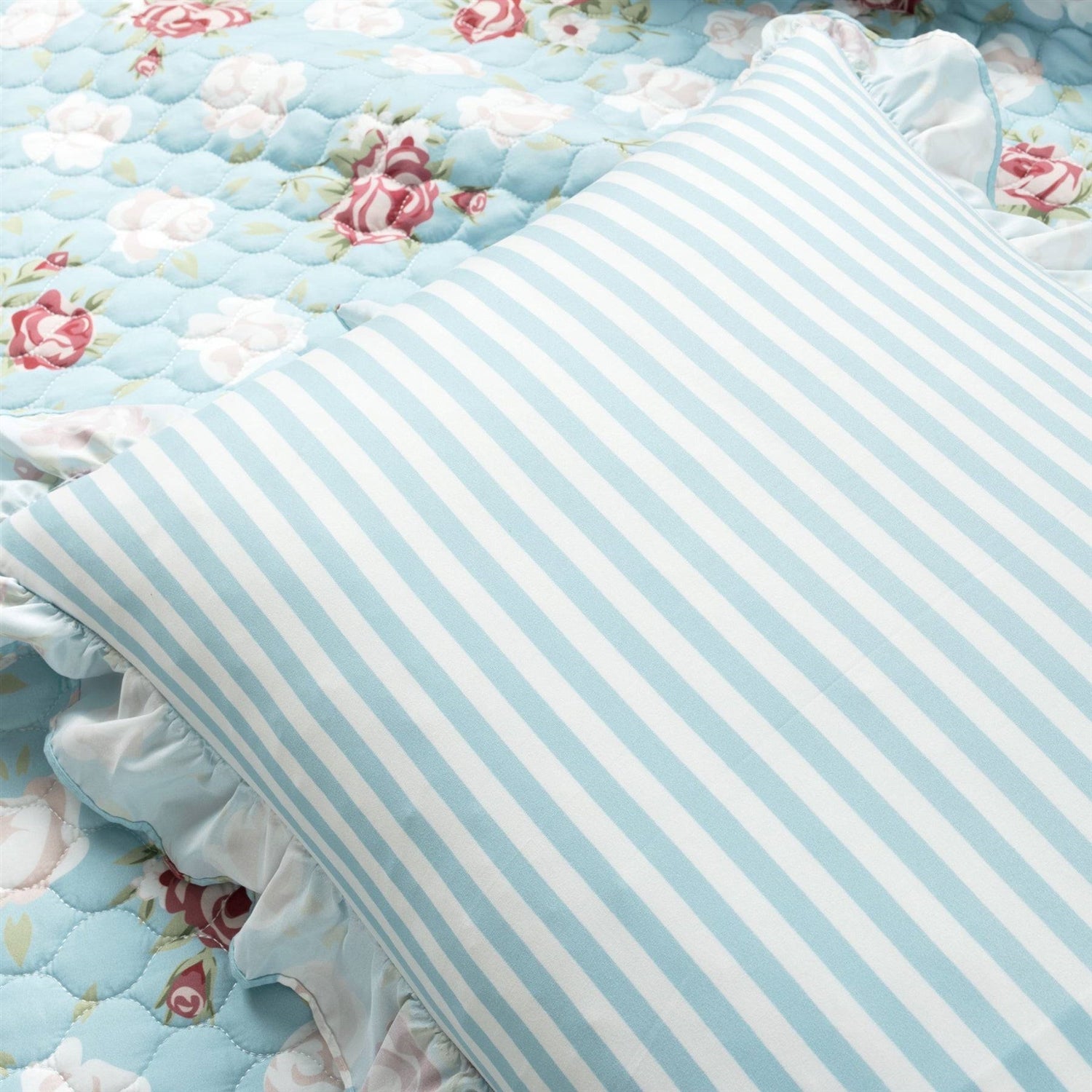 Full/Queen size Vintage Rose Ruffle Edge Light Quilt Set in Blue White and Pink