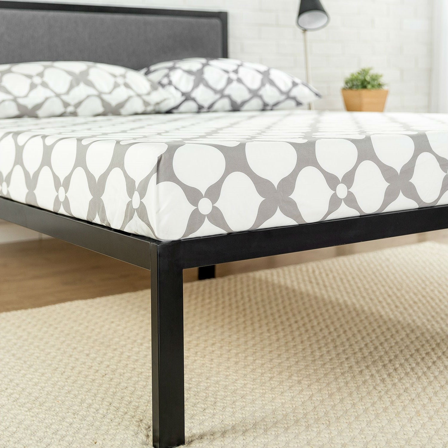 Full size Metal Platform Bed Frame with Wood Slats and Upholstered Headboard Strong wood slat mattress support prevents sagging and increases mattress life Eliminates the Need for a box Spring Assembles easily in minutes Core Composition: Wooden slats and Steel Frames Grey foam cushioned upholstered headboard 5 year worry free limited warranty