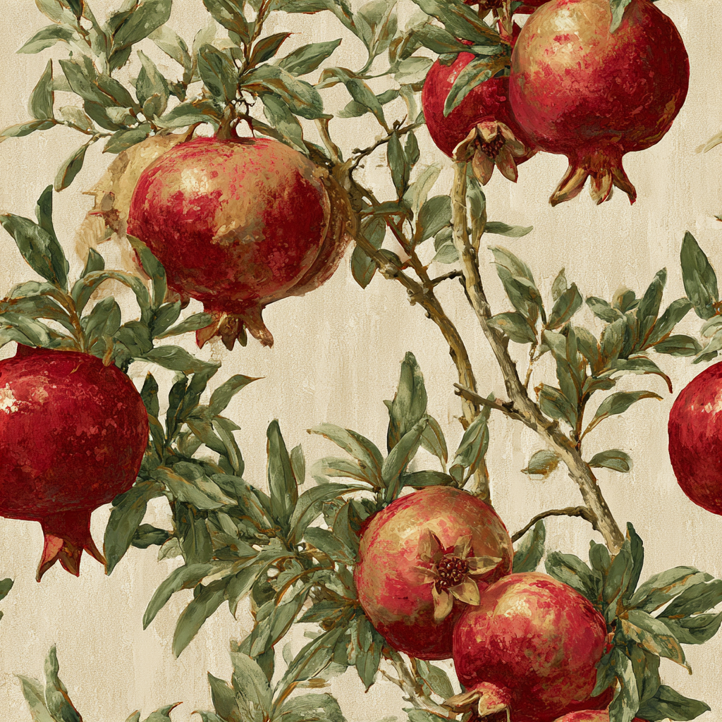 Jewel-toned pomegranates hang heavy from twisting branches, their crimson skins rich with painterly texture. Paired with olive-green leaves and a warm neutral ground, this wallpaper adds Mediterranean drama to wine rooms, entryways, or accent walls seeking a sense of richness and vitality.