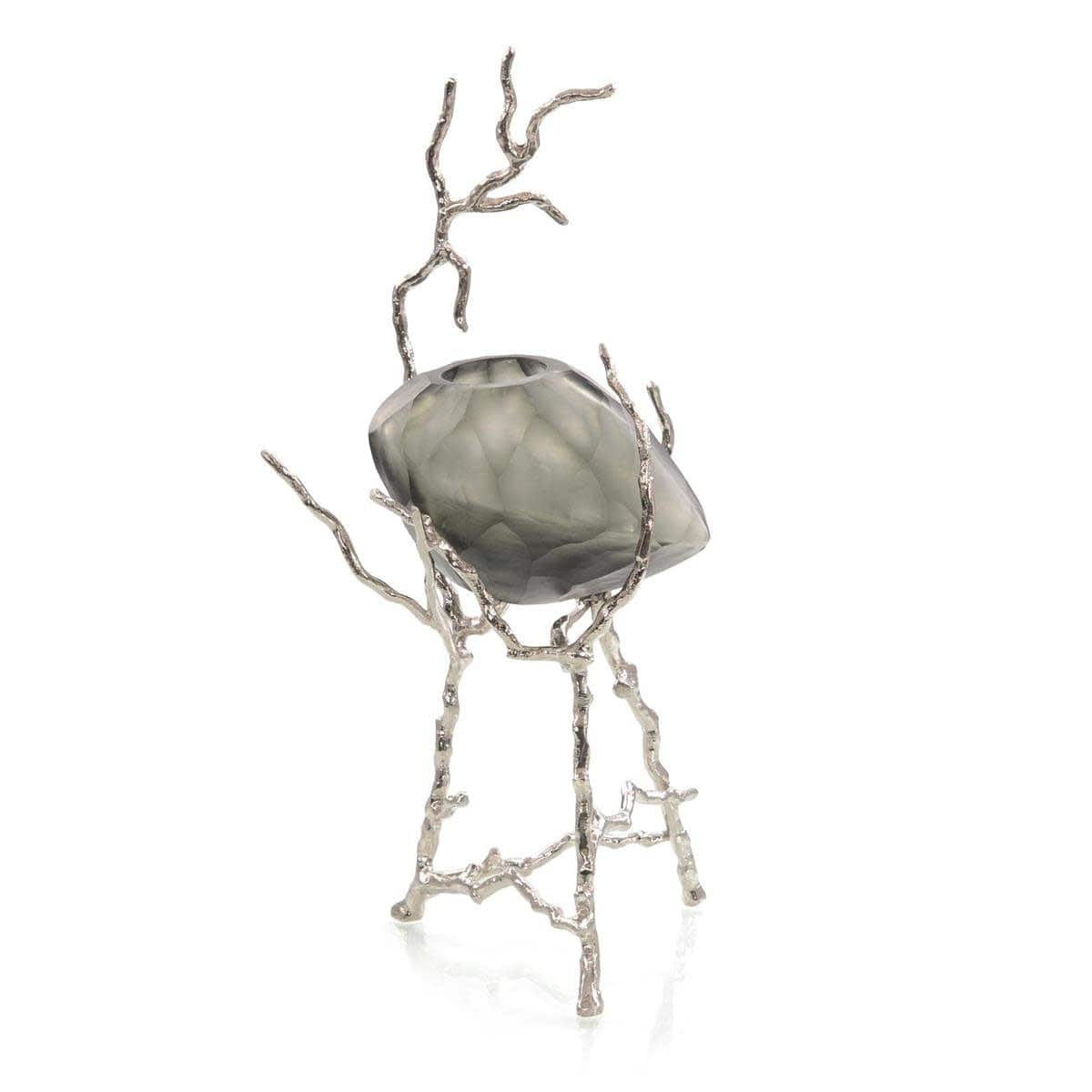 The Garrel by John-Richard is a stunning piece that combines artistry and elegance. This carved glass vase, in cool tones of grey-green, is beautifully suspended in a stand made of polished nickel branches. Its unique design makes it a perfect accent piece for any room, adding a touch of modern sophistication and natural beauty.