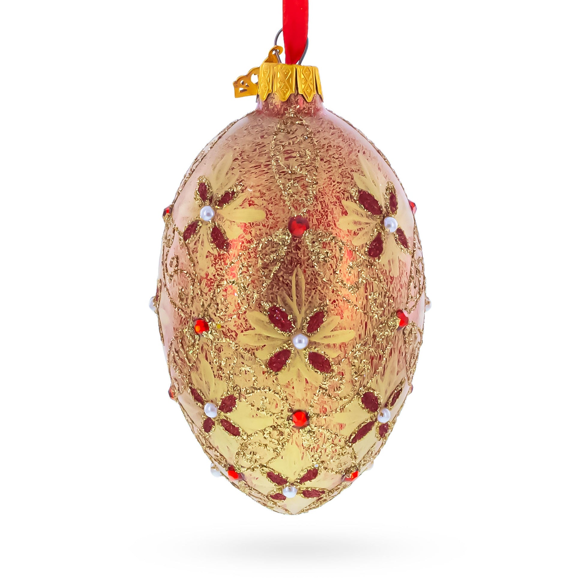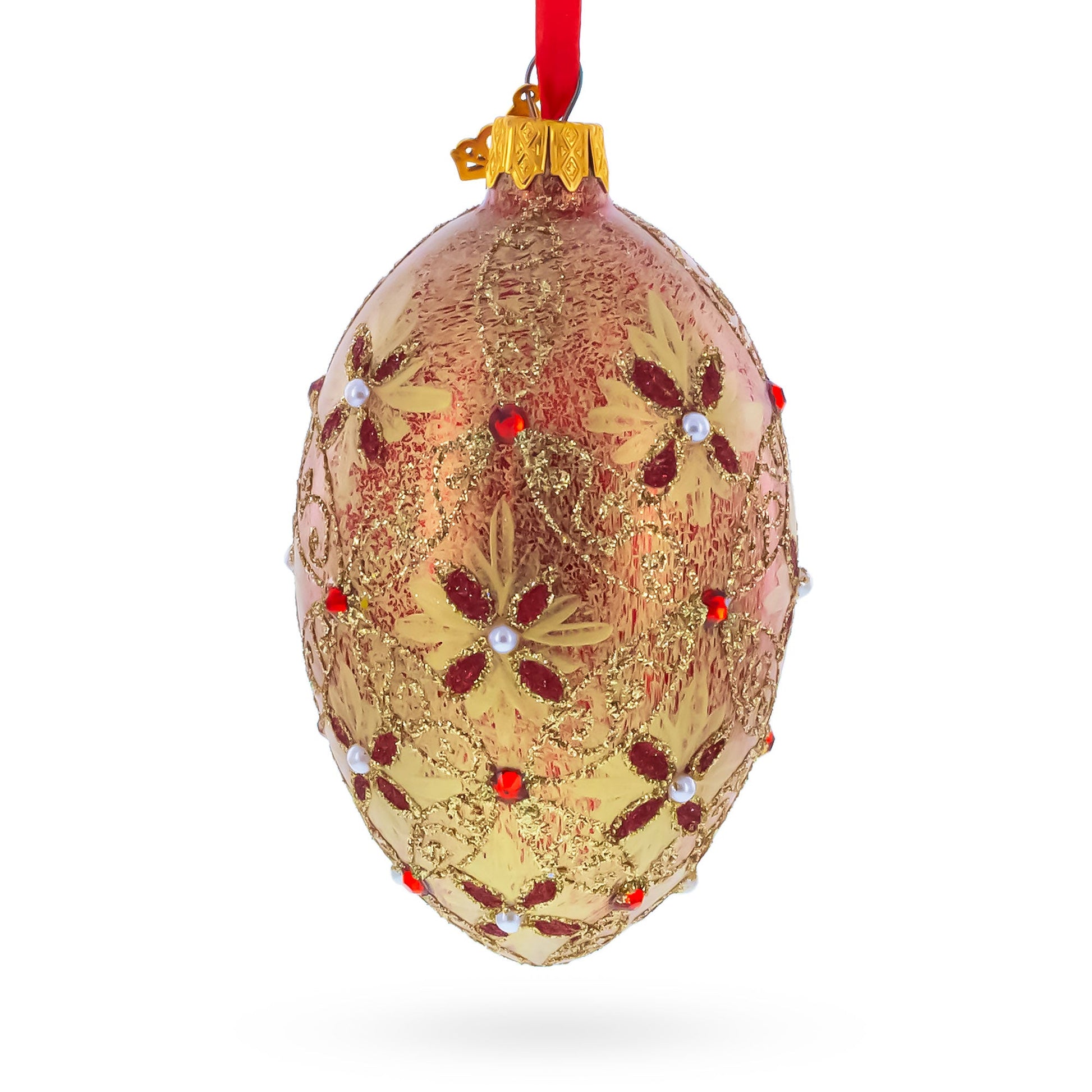 Gilded Bloom & Pearl Lattice Jeweled Glass Egg Ornament 4 Inches