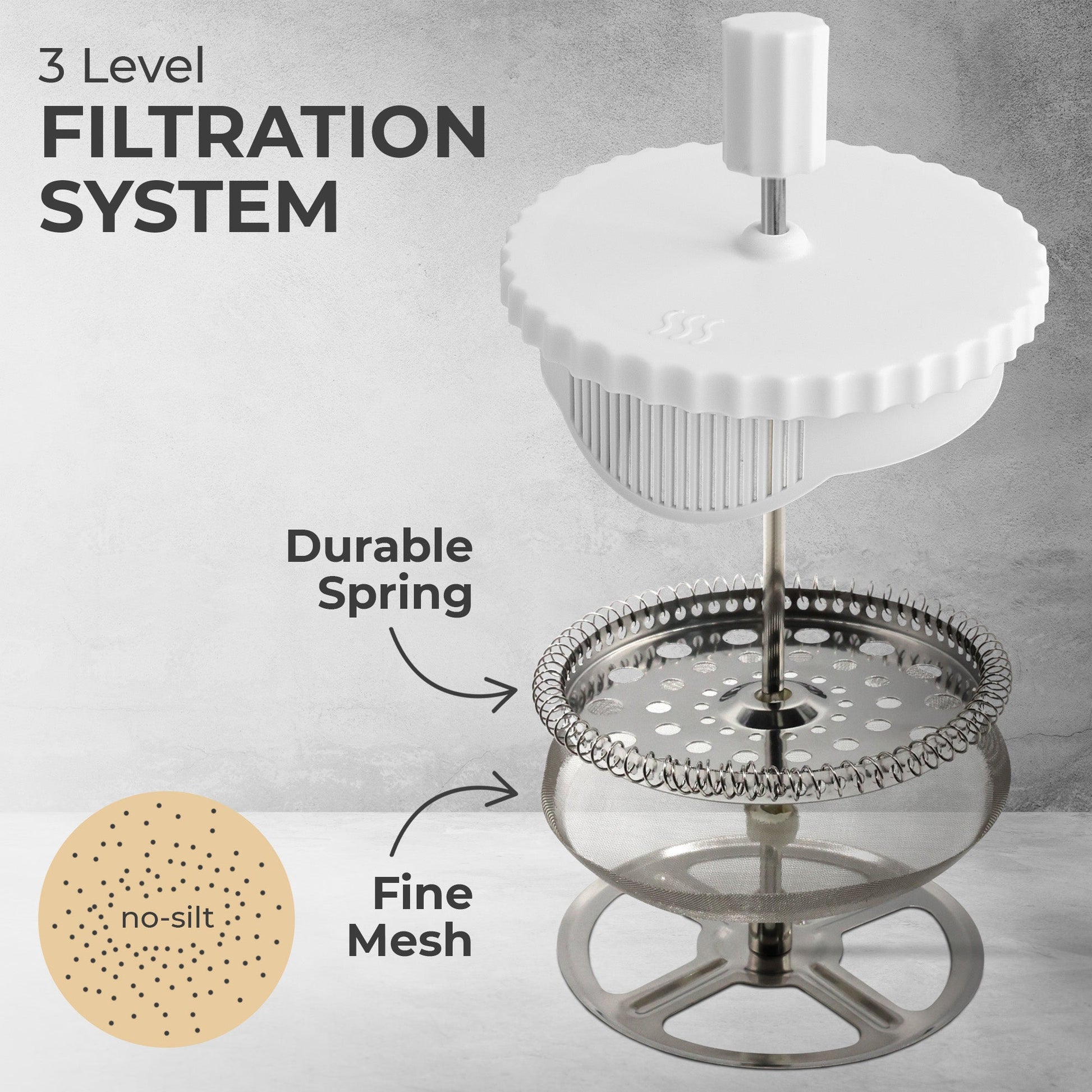 EASY TO USE - Simply remove the lid with the filters and add coarse coffee to the French press coffee maker, add hot water, brew for 9 minutes, and press with the lid on. Done! Home made french press coffee in under 10 minutes!