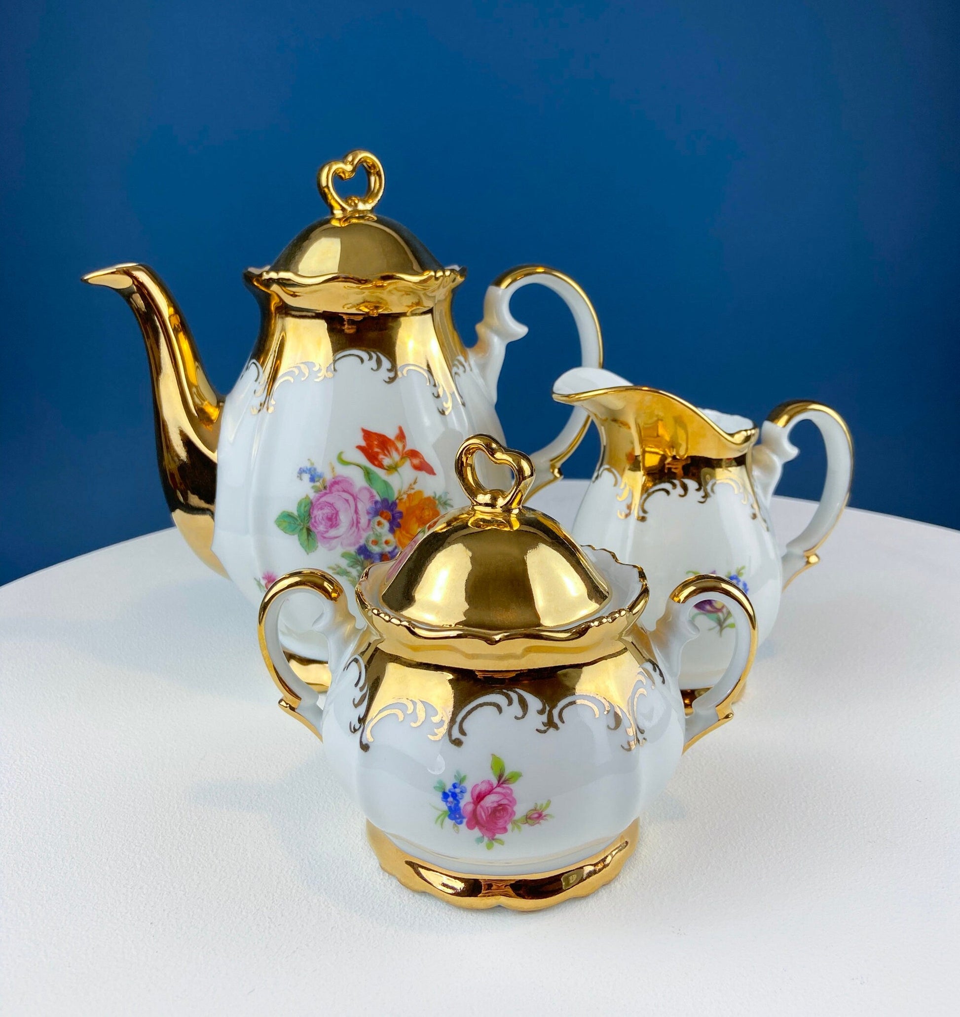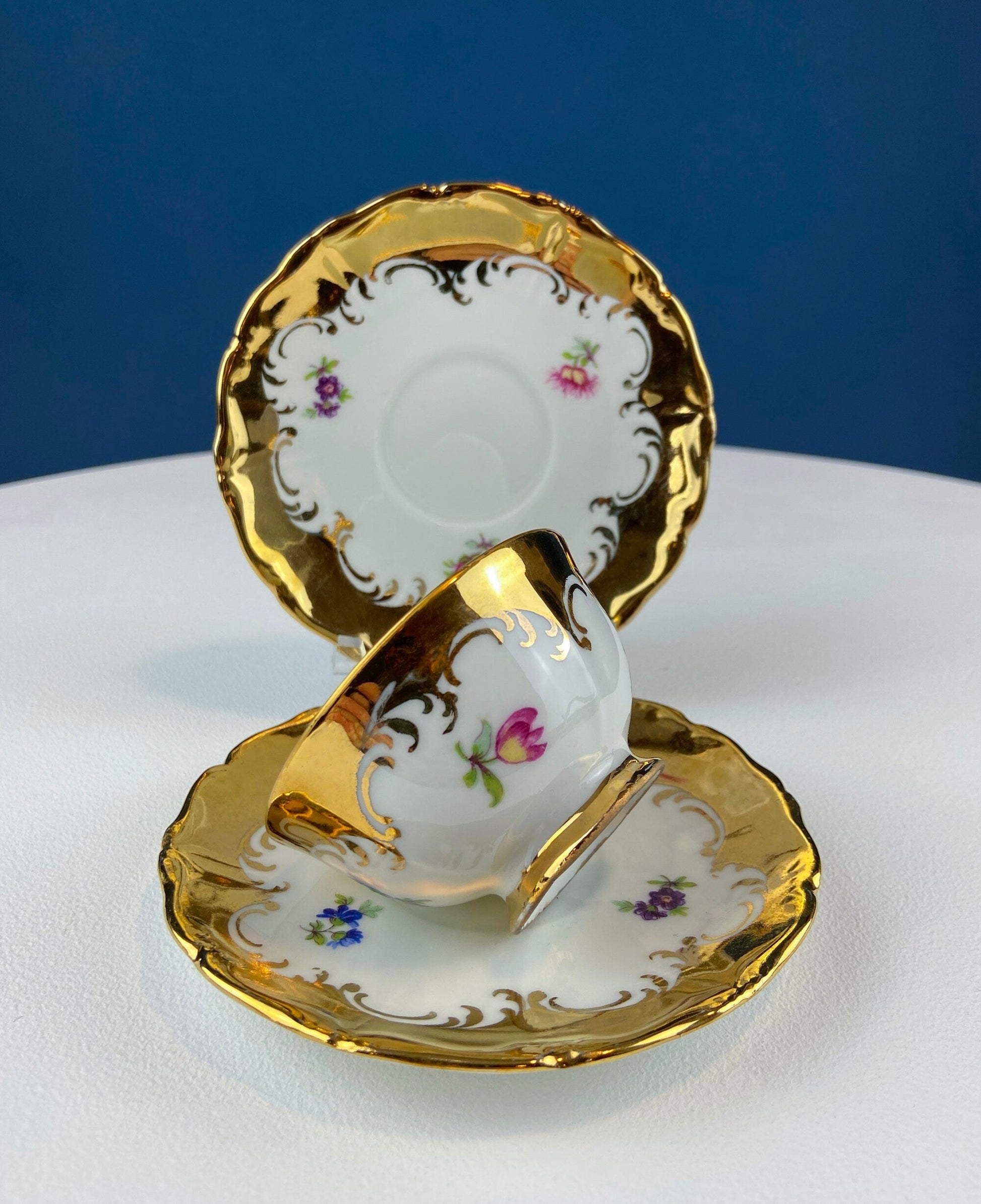 Gold Demitasse Tea Set. Prussian Hand painted Coffee/Tea Pot Sized for Two, with Matching Creamer, Sugar Bowl/Jar & 10 Cups and Saucers. Rich Gold Rims and Floral Motifs. Gift for Friend or Spouse. Excellent Condition. Marked by Manufacturer.