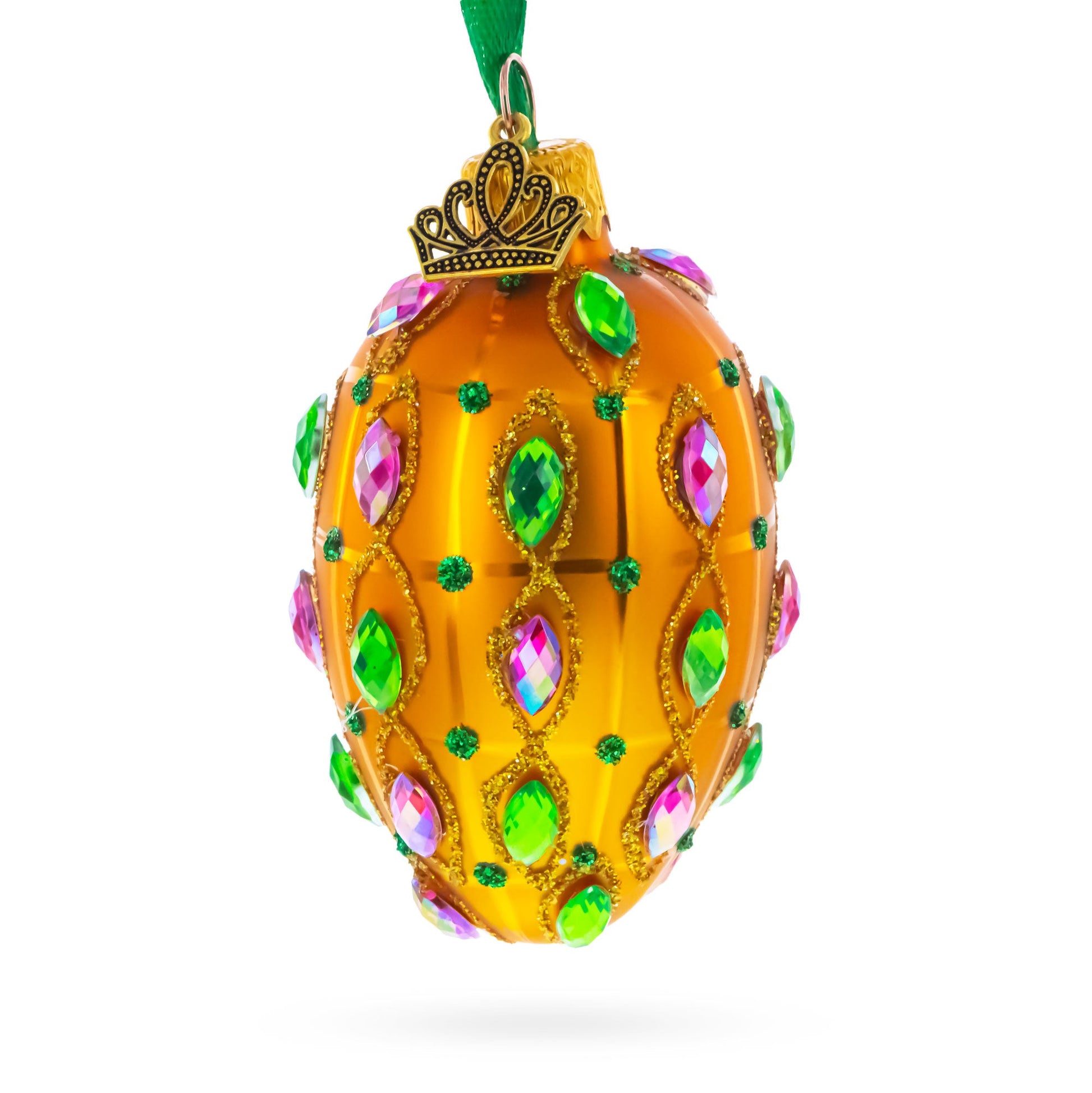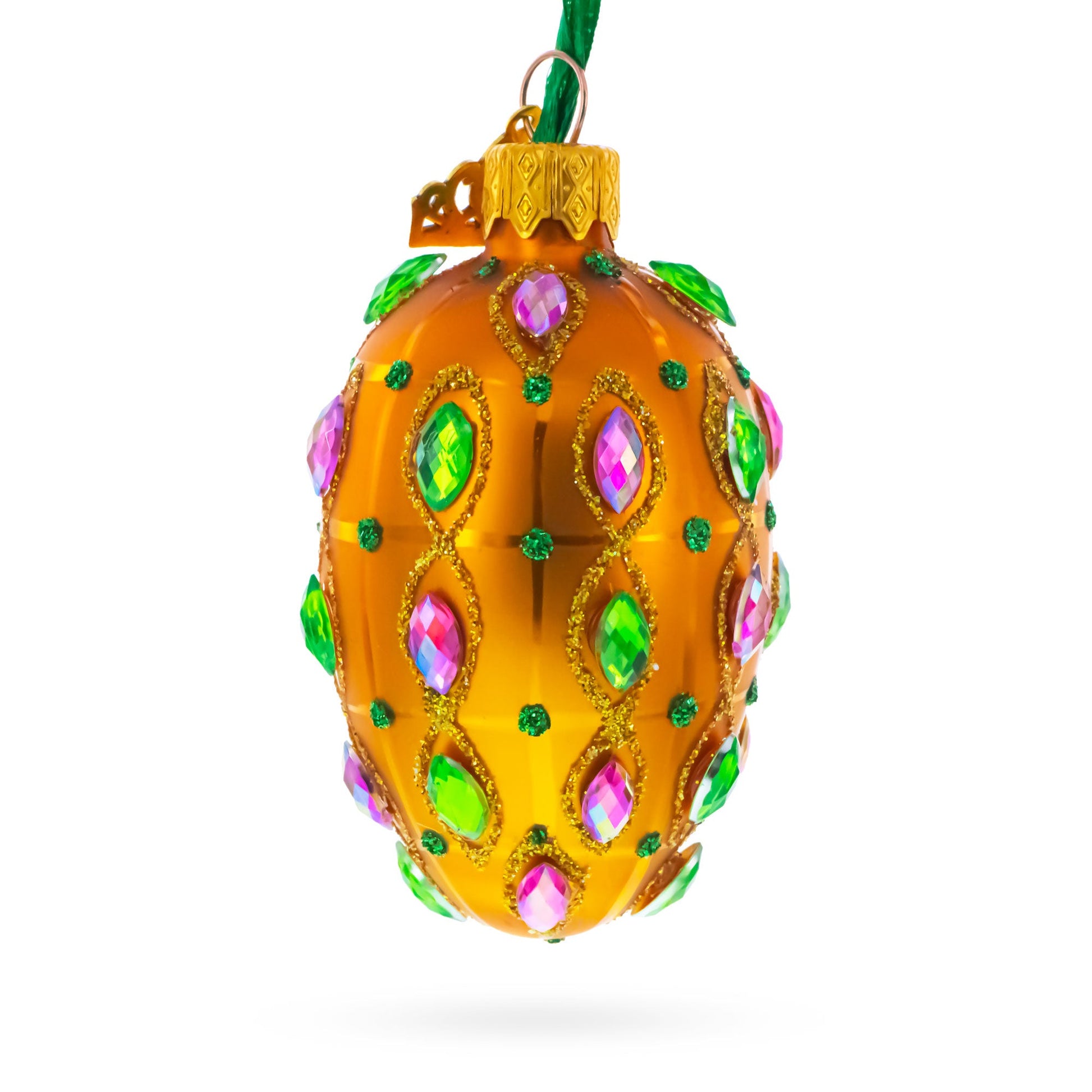 Golden Amber with Pink & Green Jewel Accents Mini Glass Egg Ornament 2.9 Inches