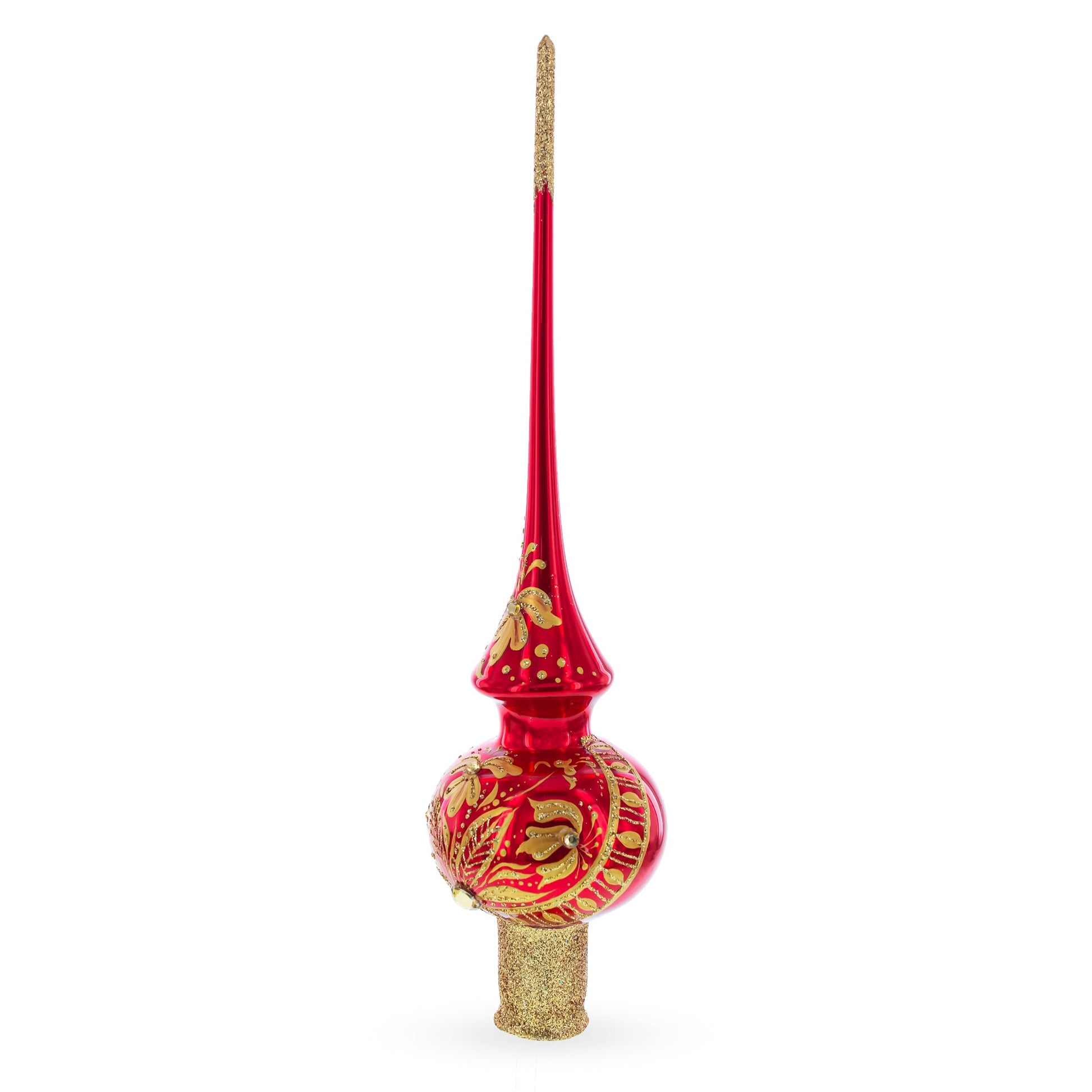 Golden Flowers Bouquet on Glossy Red Glass Christmas Tree Topper 11 Inches