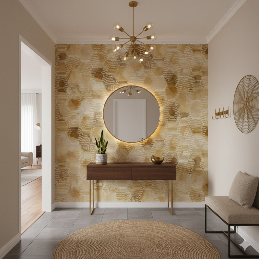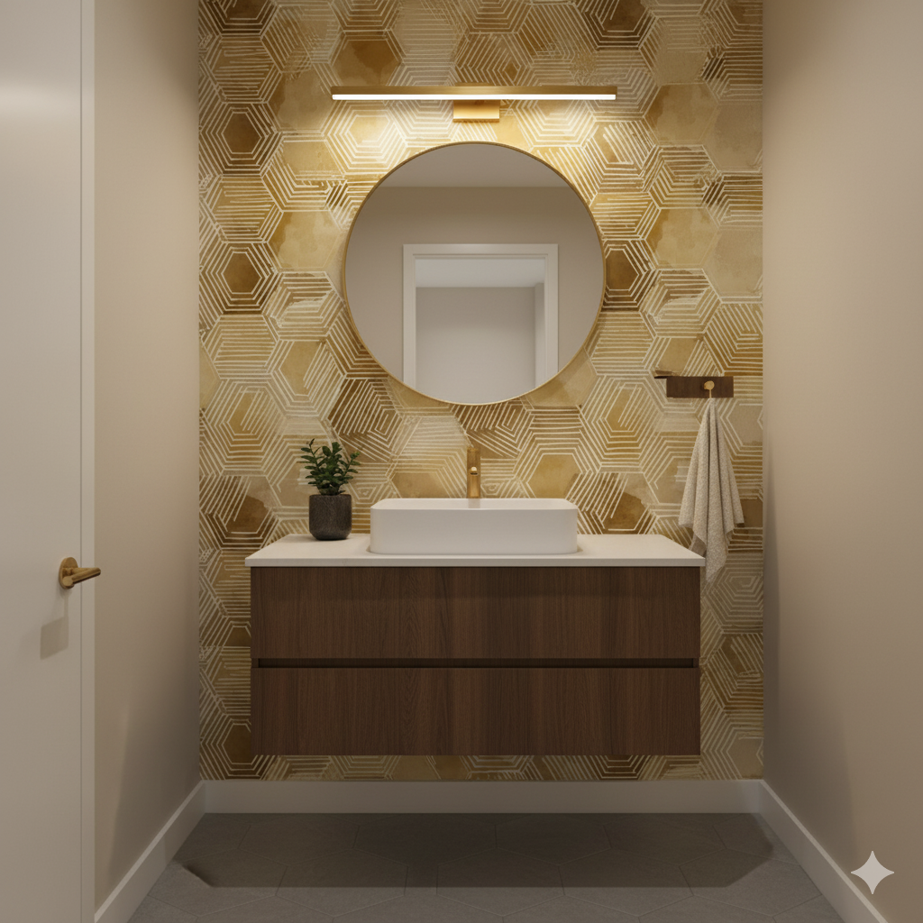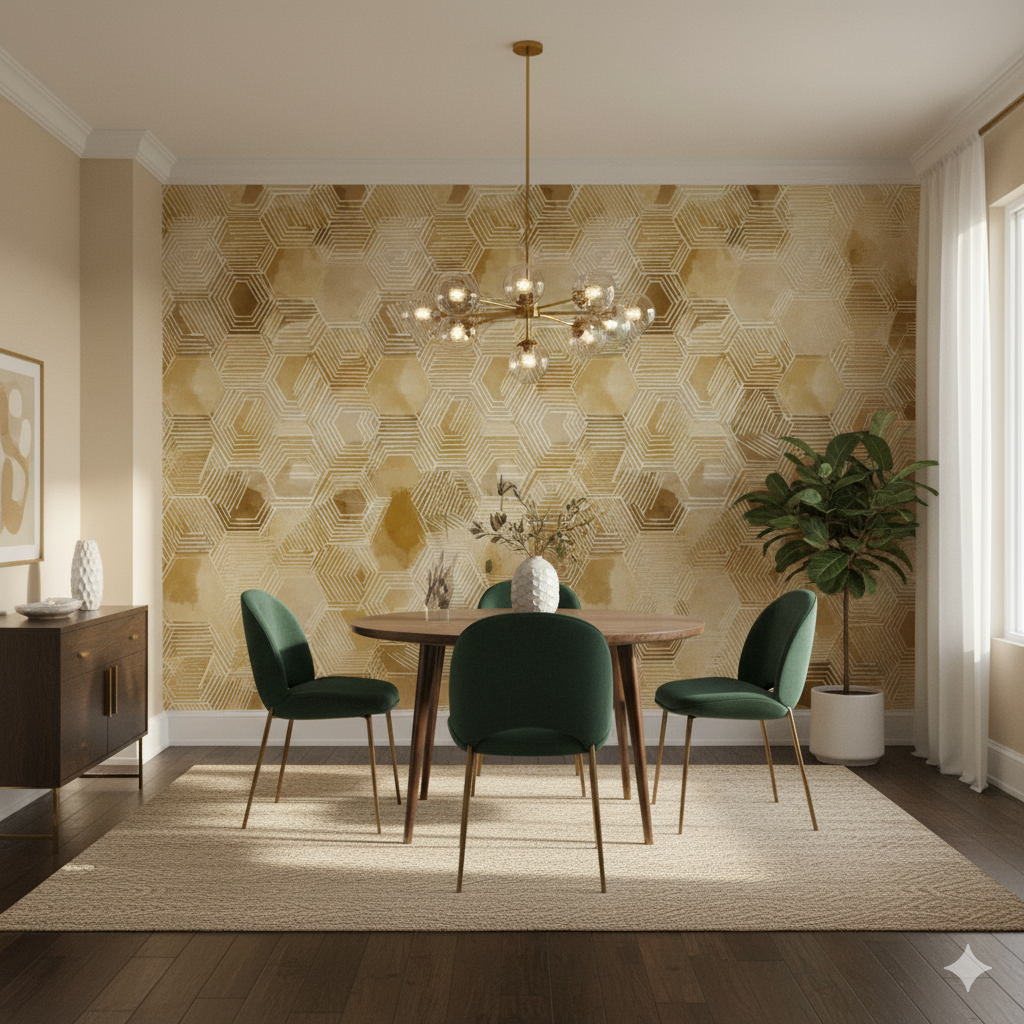 A modern take on honeycomb geometry, this wallpaper features overlapping hexagons outlined in white linework against a watercolor wash of ochre, caramel, and amber tones. The design mimics both beehive structure and artisanal tilework, with its layered, radiating forms creating depth and energy. Perfect for kitchens, craft rooms, or modern dining areas, this pattern adds warmth and rhythm to a space. Its organic geometry makes it versatile for both contemporary and rustic interiors, pairing well with natural wood and matte black fixtures.