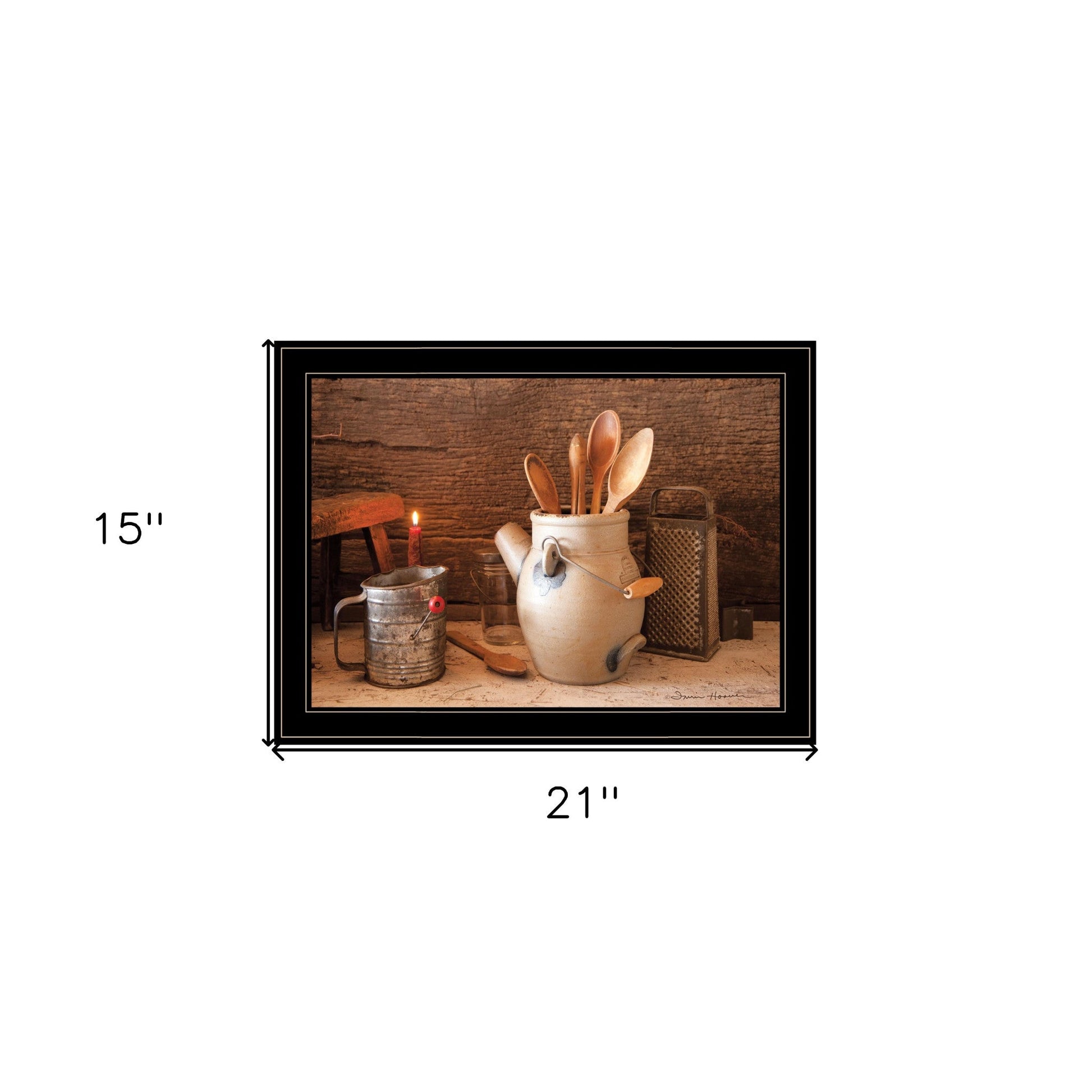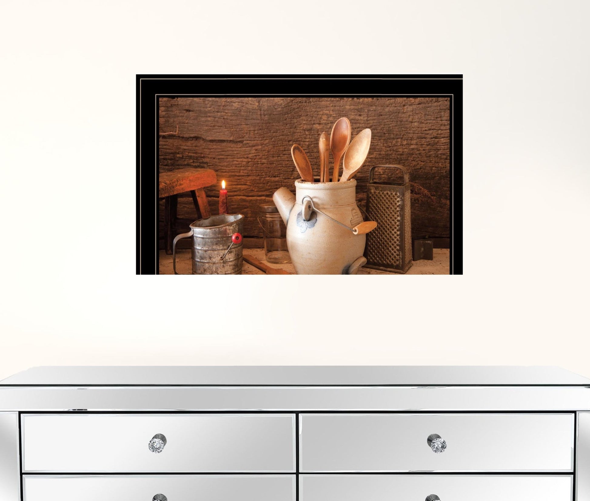 Unique and decorative, this grandmas kitchen tools 3 black framed print kitchen wall art will leave a lasting impression. This print is a visual artistic expression that allows you to decorate your space in style. Reproduced for you on paper, this hanging decorative accent will be a trendy and fashionable way to dress your walls. Hang on your wall to add some up to date fashion and decoration. Utilize this opportunity to create a focal point in the room with this fabulous wall decor option. 15-inch H x 21-inch W x 1-inch D