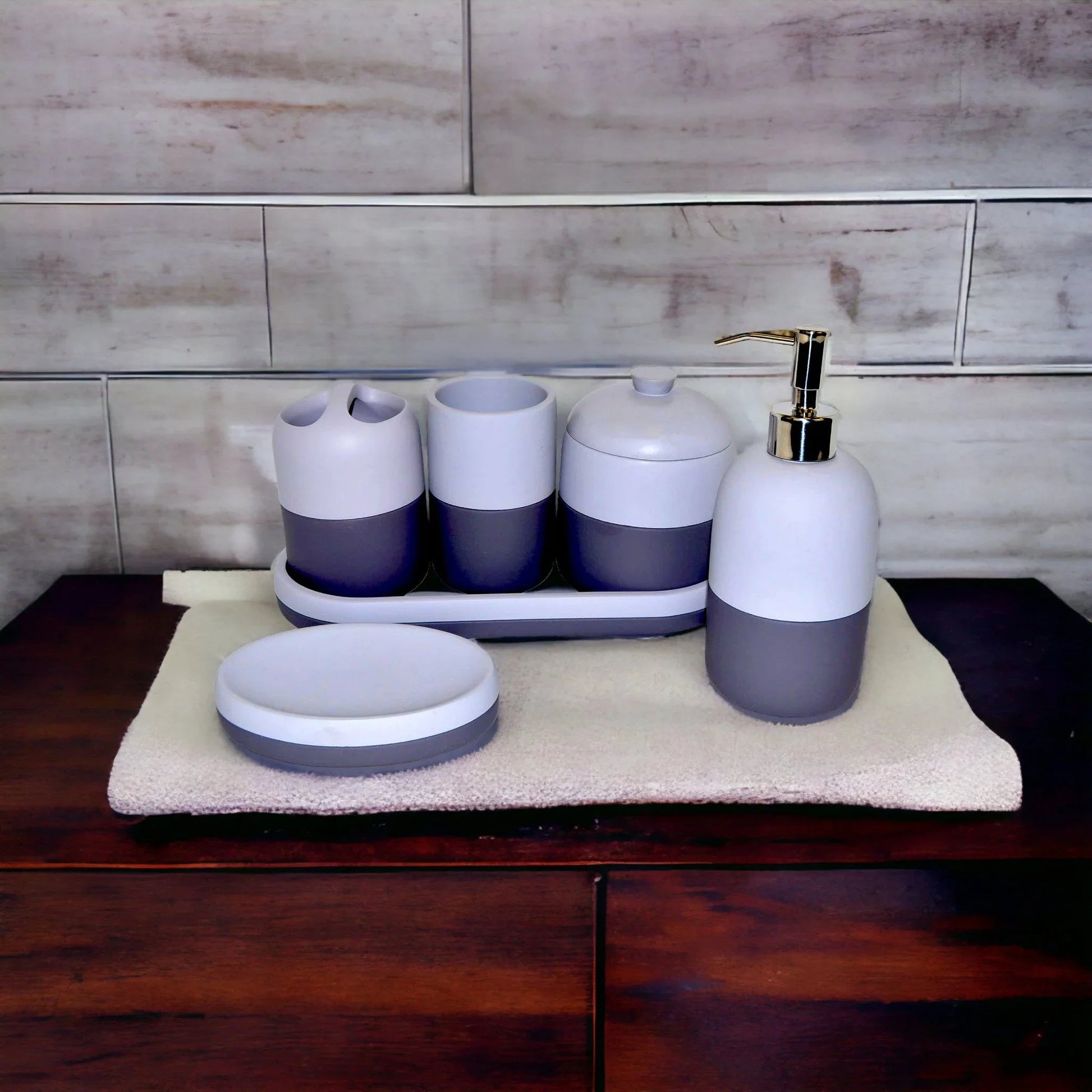 Gray Bathroom Accessories Set with Vanity Tray