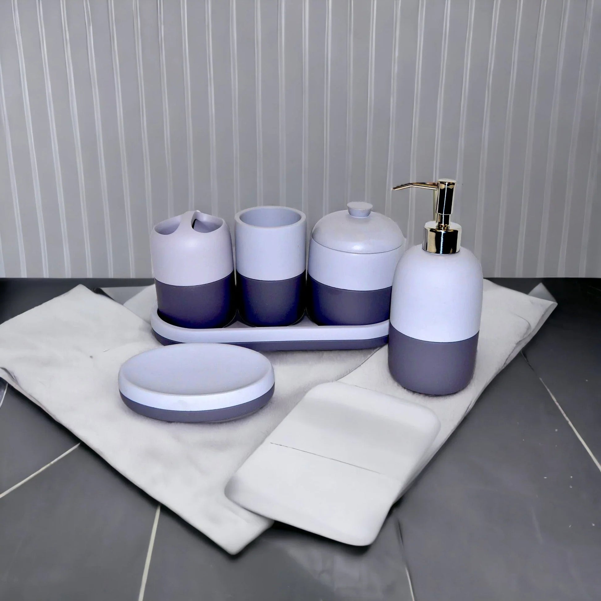Boasting an eye-catching contrast of light and dark grey tones, this six-piece gray bathroom accessory set includes a vanity tray. It enhances your bathroom with equal parts style and practicality. Constructed to last, this bath set provides a pleasant look and the convenience you need. The sturdy design and elegant contrasting colors of this bathroom accessory set brings sophisticated charm to your bathroom decor. Enjoy the convenience of having all your essential bathroom accessories in one stylish package with this tasteful vanity tray.
