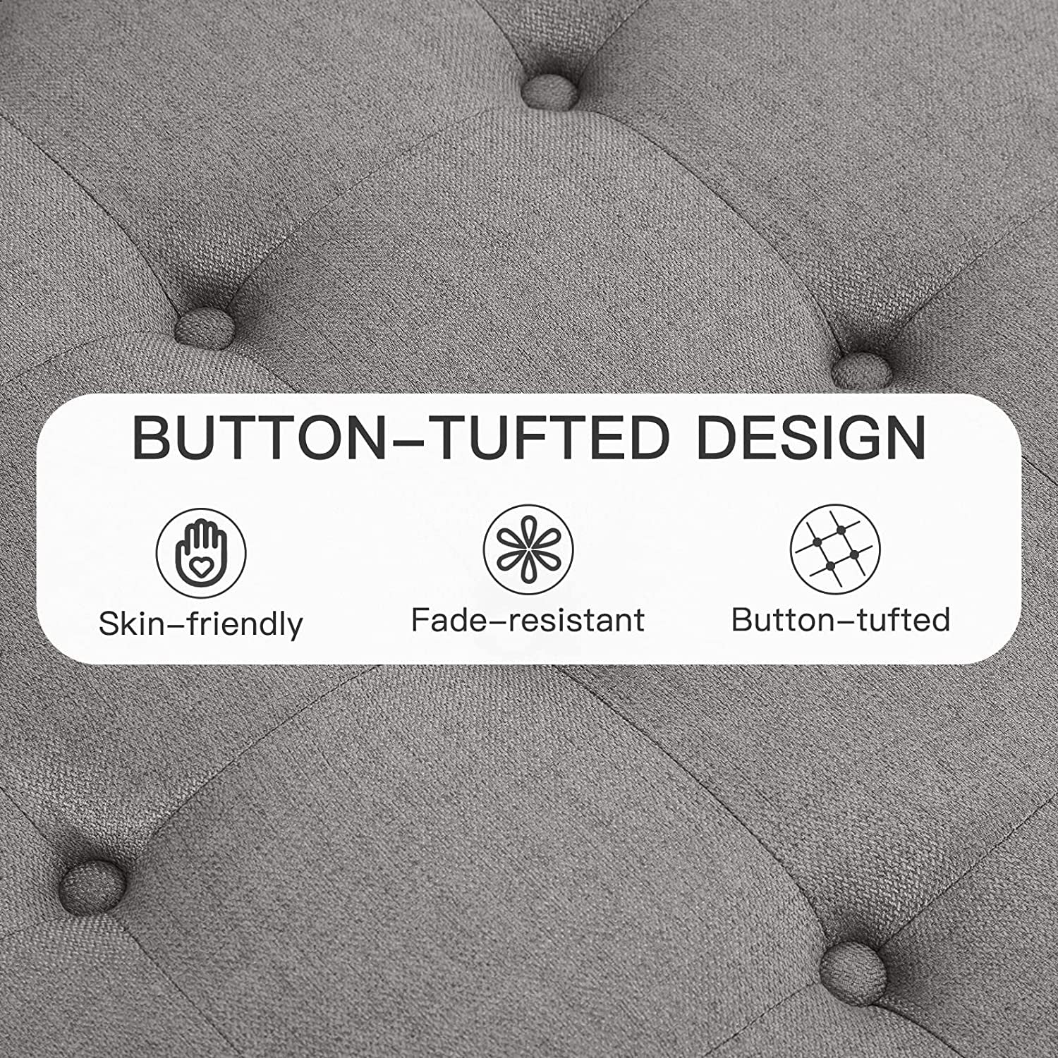 - Elegant tufted design in soft grey fabric with button-tufting adds a refined, luxurious touch to any room.
