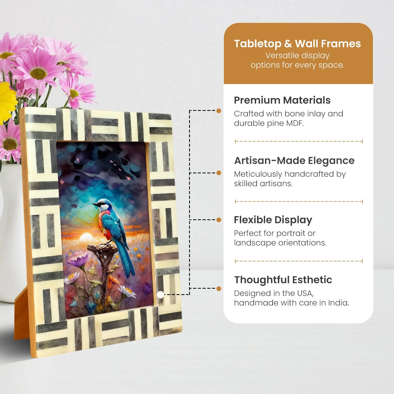 Add refined elegance to your home with the Handicrafts Home Picture Frame, expertly crafted from ethically sourced grey & white bone inlay in a striking brick pattern. Mounted on durable pine MDF, this decorative photo frame blends artisan craftsmanship with timeless style. Each frame is uniquely made, adding an eco-conscious and stylish touch to any home decor.