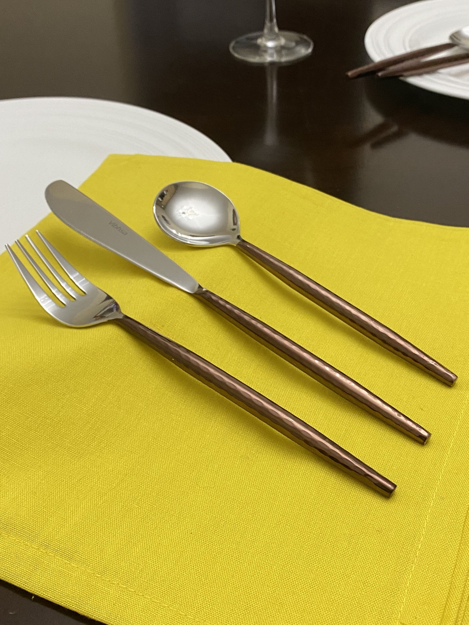 Set includes table setting for 6. Handcrafted flatware set includes 6 pieces of each 9" table knife, 7" soup spoon and 7.5" dinner fork.