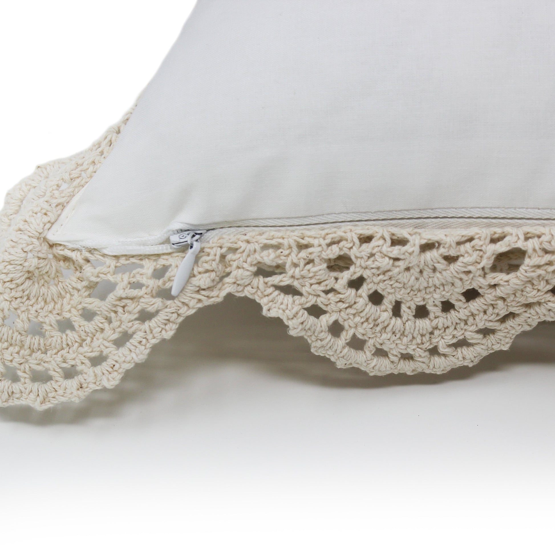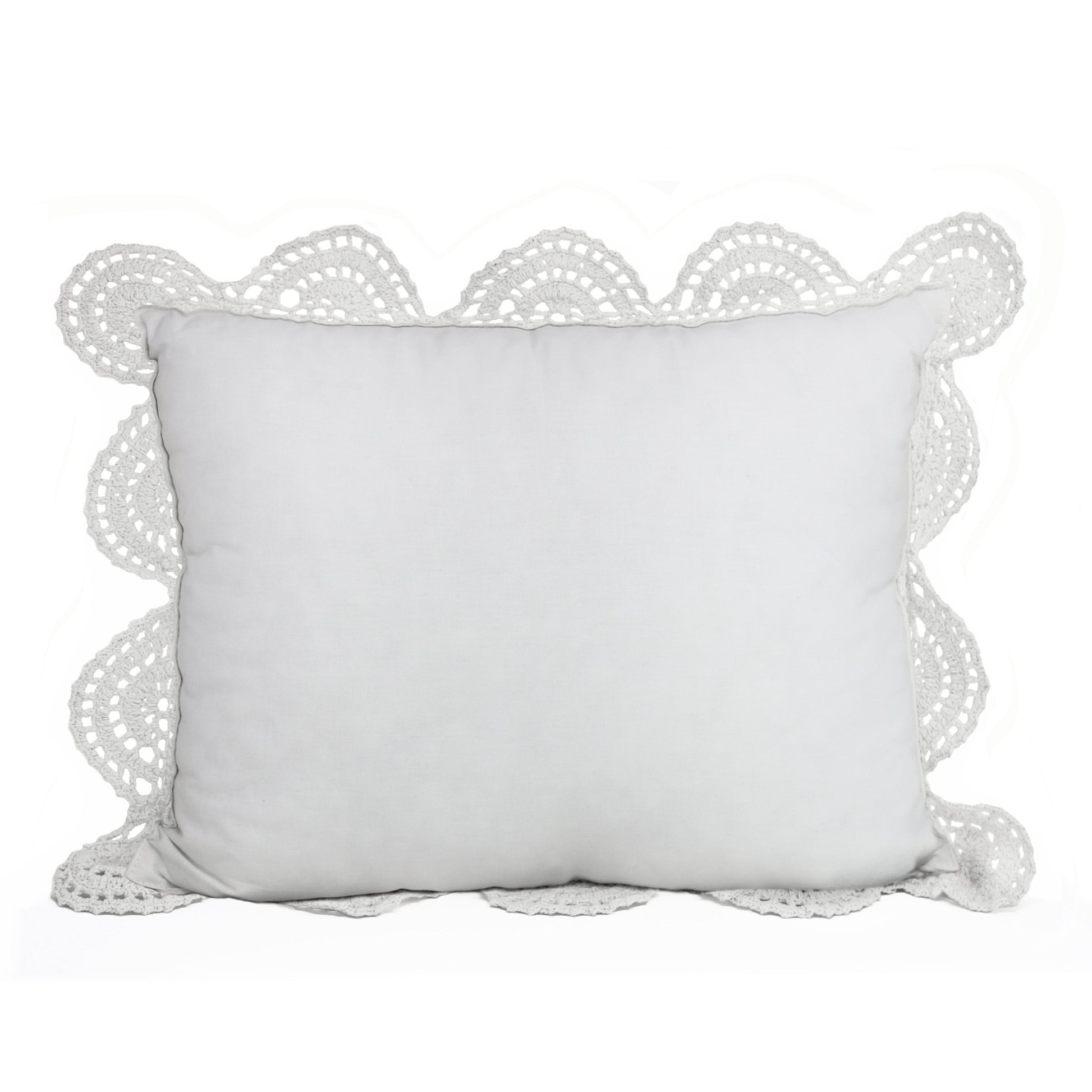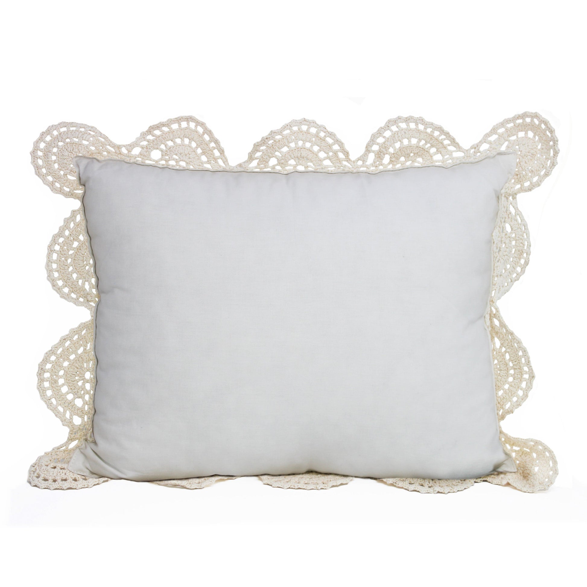 Add a touch of romance to any bedroom with our elegant pillows. Crochet is a centuries-old technique that produces intricate designs and beautiful details. We continue this tradition, making each pillow cover by hand. The delicate open-work design is attached to a solid cotton backing which provides total coverage for the pillow. The removeable cover features a hidden zipper. The cover can be machine washed and dried, and we suggest washing it inside a sweater bag to avoid any snags.
