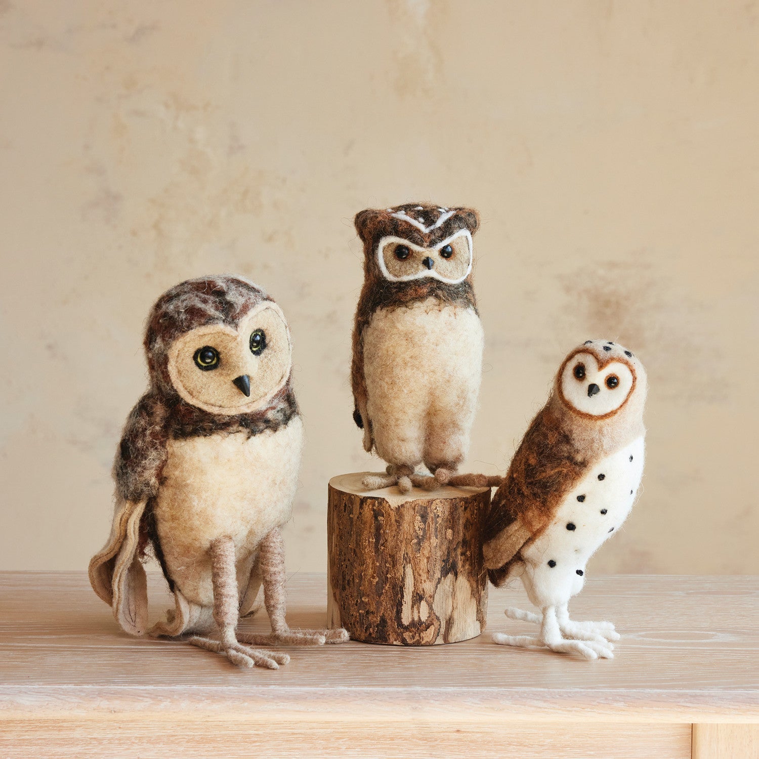 This charming barn owl is handcrafted from wool felt, bringing a cozy, natural feel to your seasonal or everyday decor. Each owl features detailed stitching and shading that captures the essence of this wise woodland creature. Its soft, textured design makes it a perfect addition to shelves, mantels, or tabletop displays.