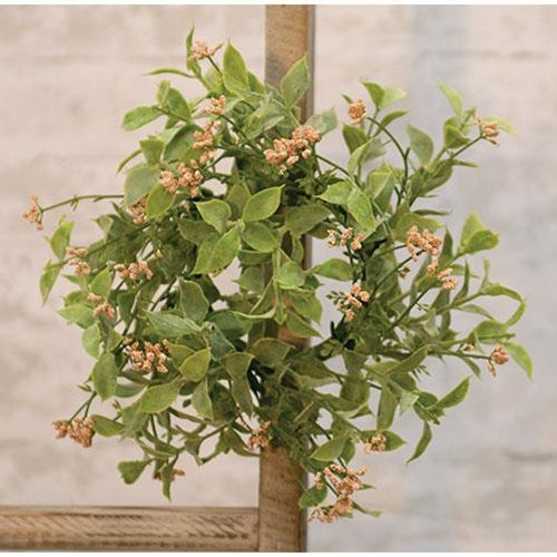 Happy Harmony Candle Ring is a springtime floral perfect for sprucing up a mantel or table setting. It is open in the middle for accenting pillar and jar candles and boasts dusty plastic greenery and plastic astilbe buds on a green base. Measures a 3" inside diameter and a roughly 9" outside diameter.