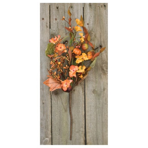 Harvest Garden Pick features a mix of fall flowers combined with mini pumpkins, pips, berries, leaves, and spirals. Pick is 14" long.