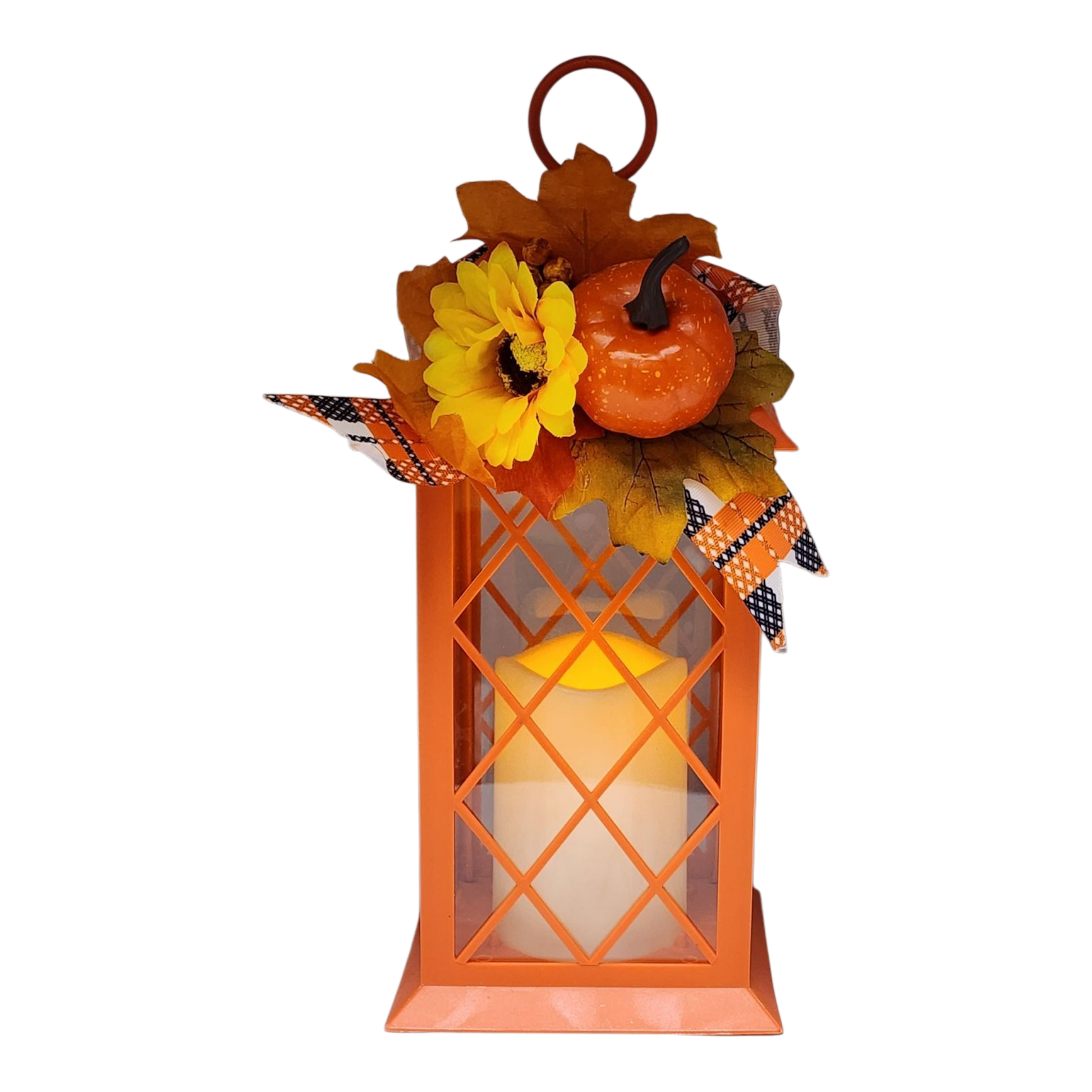 Embrace the warmth of the fall season with the delightful Pumpkin Spice Lantern with Flickering Candle! Standing at 11.2 inches tall, this beautified lantern features a vibrant orange finish that captures the essence of autumn. Topped with a cheerful arrangement of sunflowers, colorful leaves, and a charming little pumpkin, it's the perfect decorative accent to enhance your fall decor.