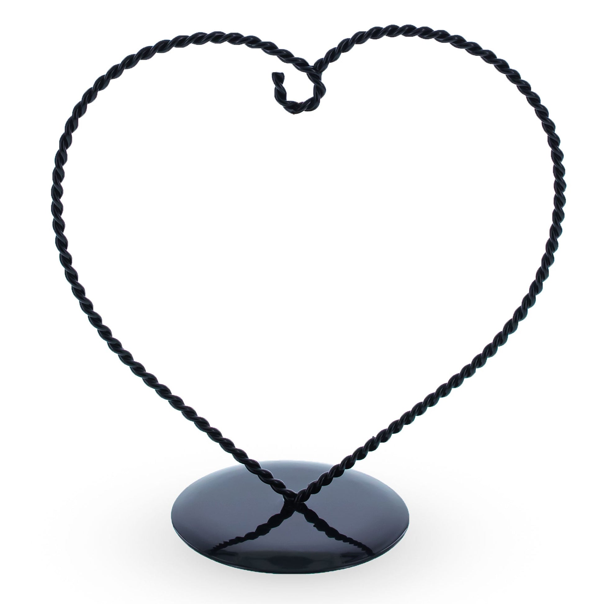 Celebrate love and elegance with this 6.2-inch heart-shaped ornament display stand. Crafted from twisted black painted metal, its romantic silhouette brings warmth and charm to any setting. The curled hook at the top provides a secure spot for hanging lightweight ornaments, keepsakes, or charms. Supported by a smooth, round base, this stand offers both stability and delicate style, making it ideal for gifting occasions, wedding favors, holiday décor, or everyday display. Its compact size fits beautifully on shelves, desks, or mantels—perfect for adding a heartfelt touch to your space.