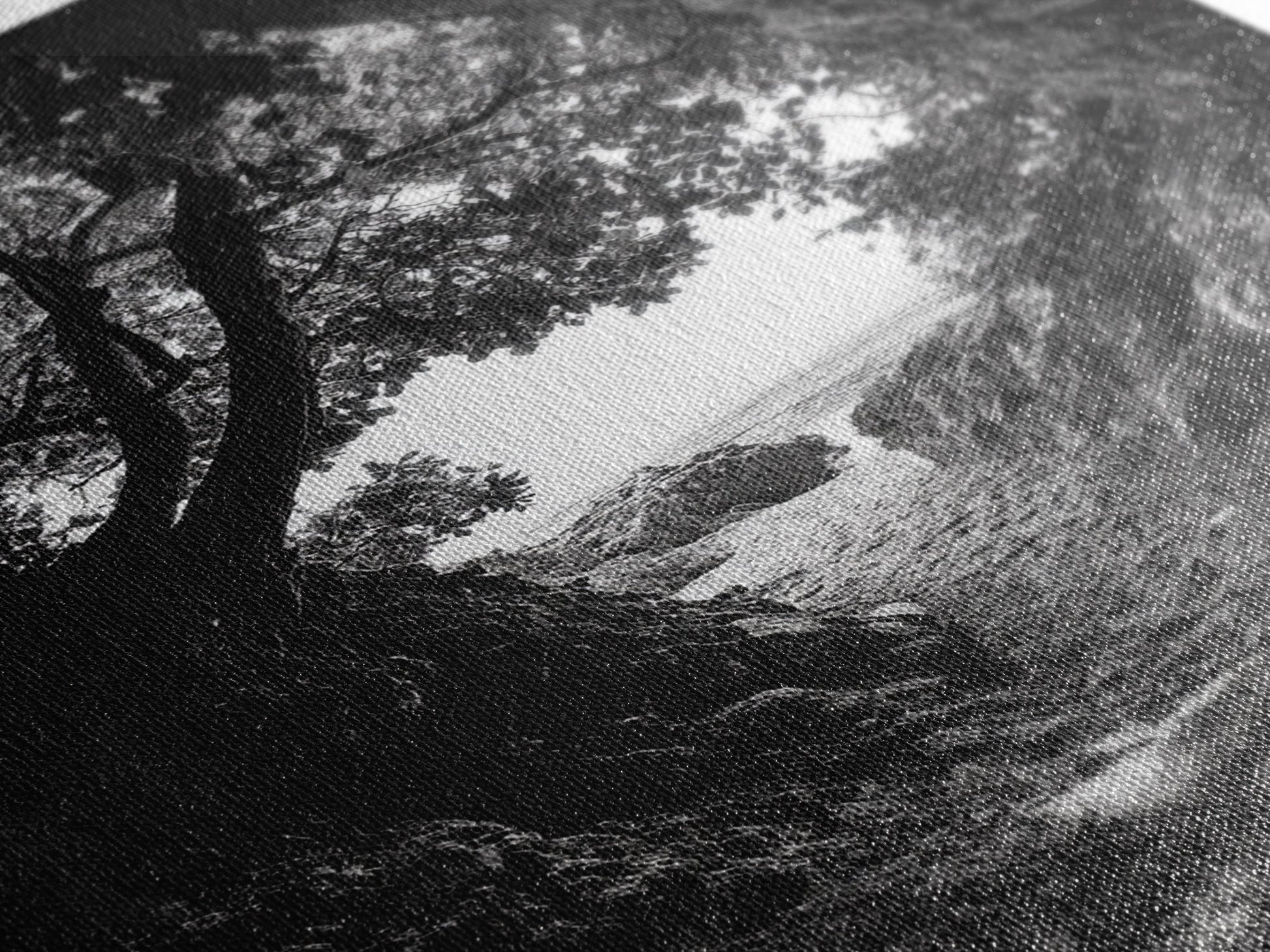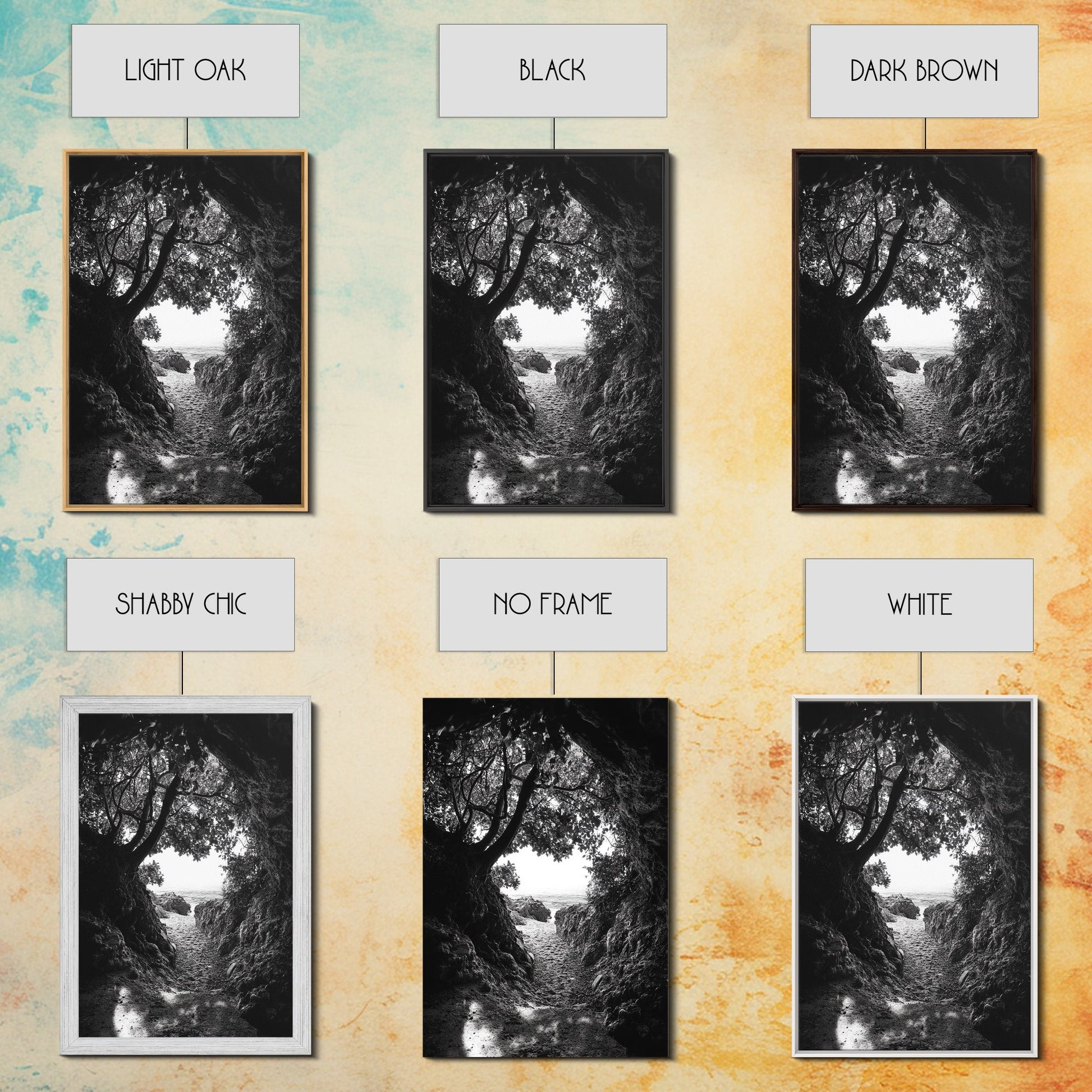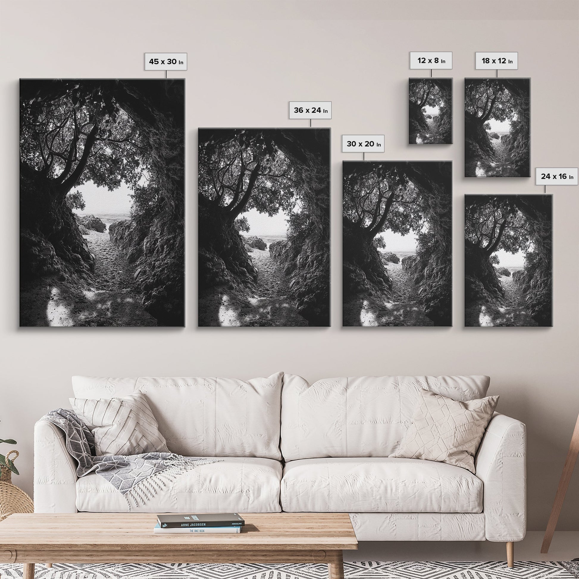 Hidden Beach, Cave Entrance, Secret Shoreline, Natural Light, Canvas Print, Bathroom Wall Decor, Travel Inspired Art, Black And White
