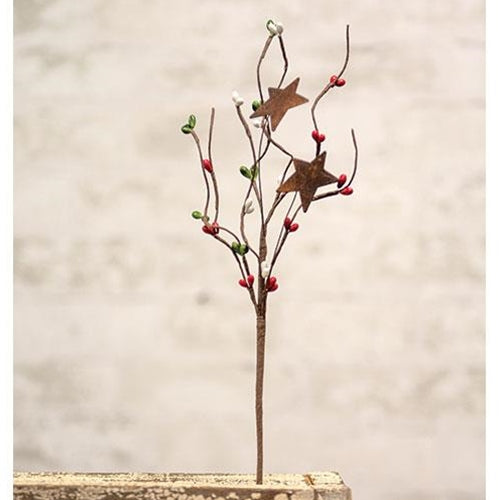 Holiday Combo Pick features a flexible brown-wrapped stem and red, green, and white pip berries, along with rusted metal stars, perfect for the holiday season. Display this pick alongside Winter florals and greenery or on its own in a vase or jar. Pick measures 12" tall.