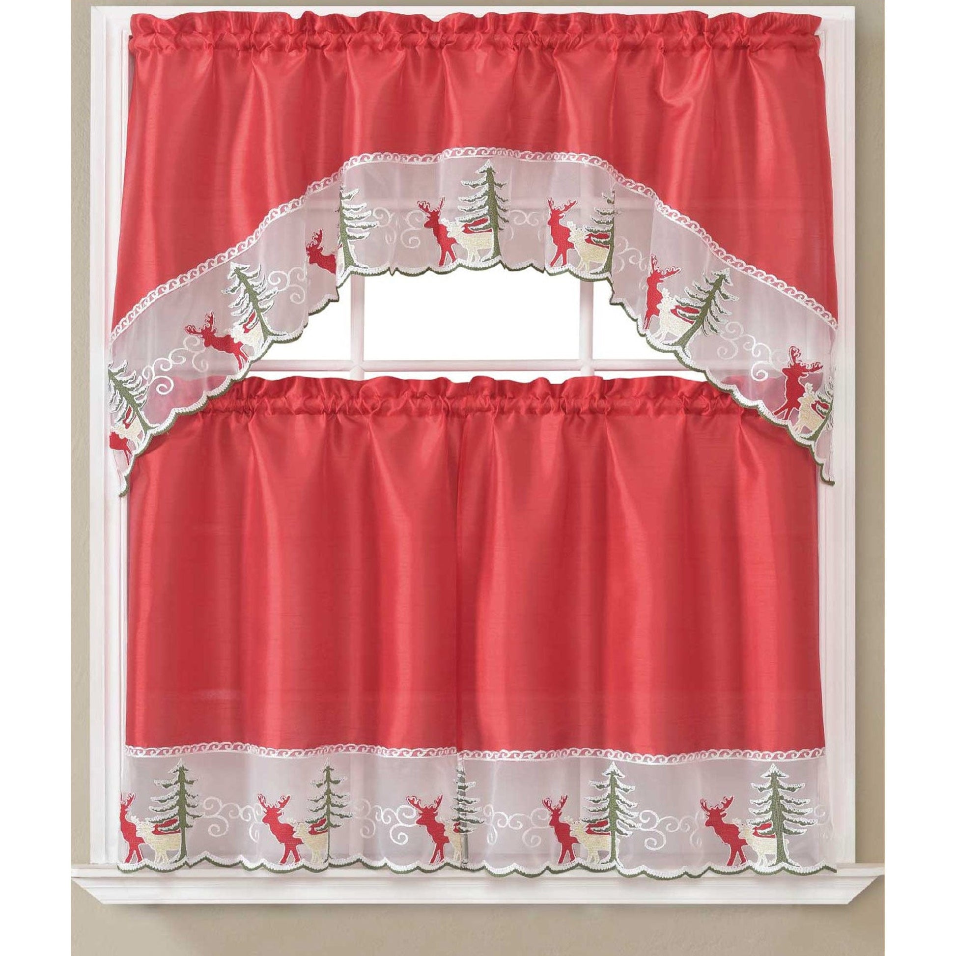 Holly Christmas Tree, Reindeer and Snow Flakes Kitchen Curtain Set, Red, Swag Valance 60x36, Tiers 30x36 Inches