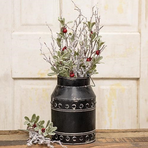 The Holly Leaves and Berries Spray is a decorative wintertime floral with a flexible green-wrapped stem. The spray is filled with rustic brown twigs, soft green leaves, and bright red holly berries, all coated in a generous dusting of white flocking and silver sparkles, giving the piece a freshly snow-frosted effect. Display this spray propped inside of a vase, bottle, or basket to give a festive, wintry touch to Christmas home decor. Measures 18.5" long. Multiple sprays depicted.