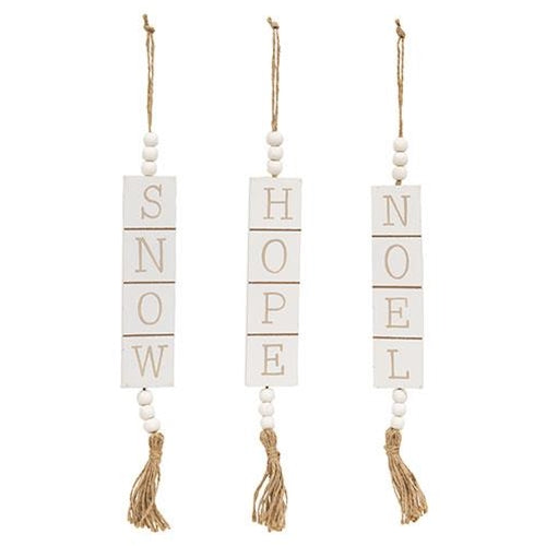 The Hope Noel Snow Tile Hangers are an assortment of three decorative ornaments made of white wooden tiles. The ornaments are accented with jute tassels, round wooden beads, and read “Hope”, “Noel”, or “Snow” across the tile charms. The tops of the ornaments include a jute loop to use for a hanging display on a Christmas tree, knob, or hook in the home. Each hanger measures 16.5” high (with hanger) by 1.5” wide by .5” deep. Please note: This item features a variety of designs which are each sold individually (not as a set).