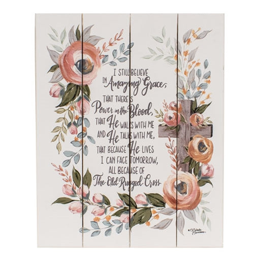 The I Still Believe Art is a decorative print made of natural-grain shiplap wood with a slat design and white painted finish. The piece features a painted pink floral wreath and wooden cross, along with gray script lettering reading “I still believe in Amazing Grace, that there is power in the blood, that He walks with me, that He talks with me, that because He lives I can face tomorrow, all because of the old rugged cross”. This print is inspiring and encouraging, ideal for the Spring, Easter, or everyday home. Display this piece propped or hanging on a wall, using the metal sawtooth hanger. Measures 12” high by 9” wide by .75” deep. Made in the USA!