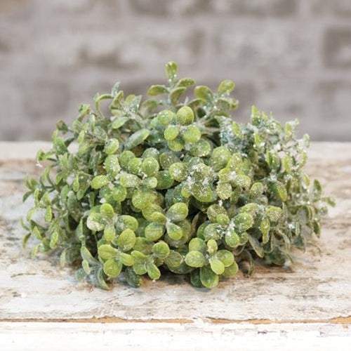 The Icy Pebble Eucalyptus Half Sphere, 8" is made of plastic eucalyptus leaves and rests on a plastic base. The leaves have been flocked with glitter for a wintry finish making it an ideal pairing for white candle jars and pillars. The greenery of the leaves is suitable for year-round use and elegant centerpieces.The inside diameter measures 3" and it measures 8" across.