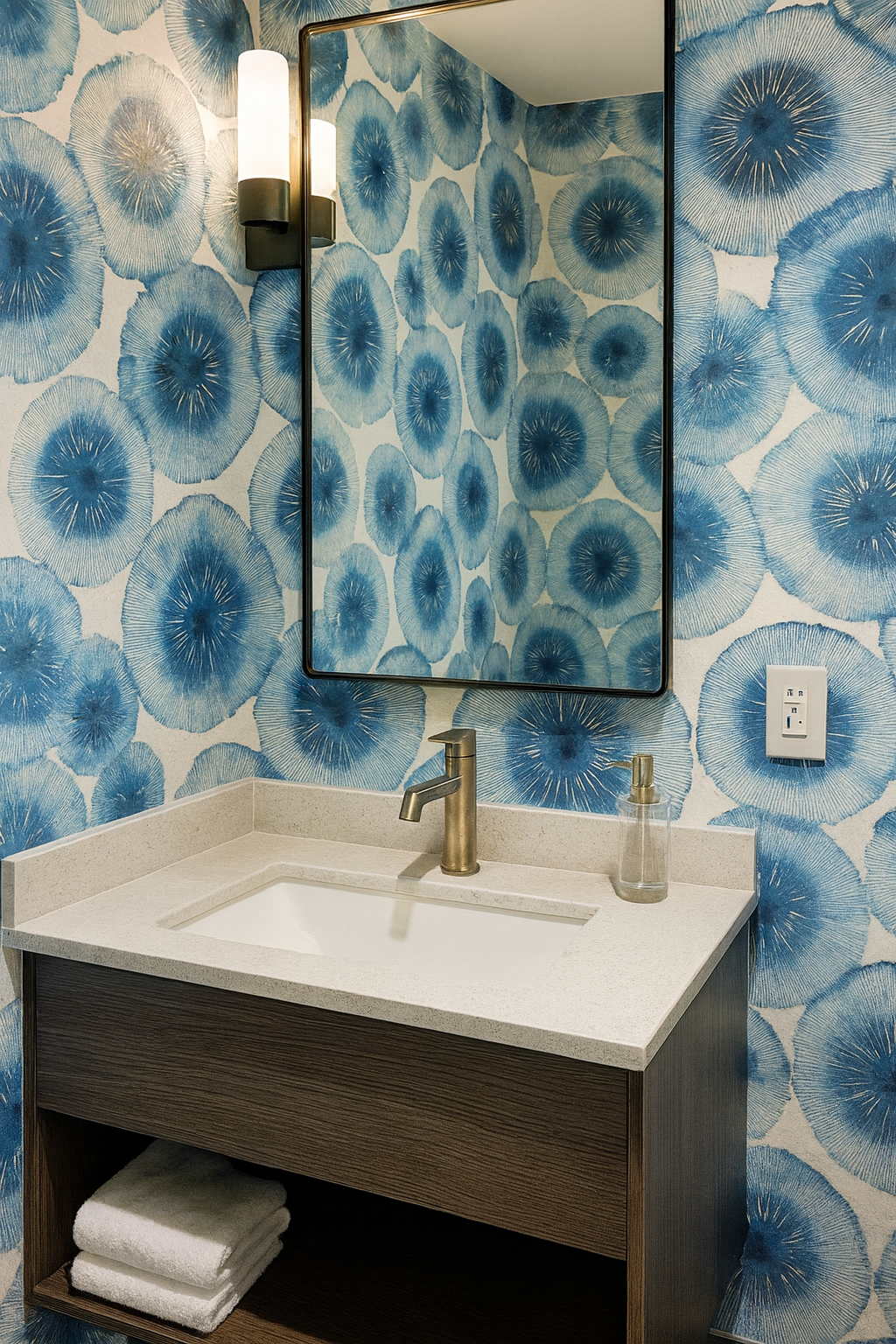 Indigo Fungi Bloom is a mesmerizing display of watercolor-style mushroom gills or sea anemone-like bursts in rich indigo and denim blue. With radiating fine lines and irregular organic shapes, it brings a modern botanical twist to walls. Ideal for accent walls in creative spaces, modern bathrooms, or nature-inspired interiors seeking an artistic and slightly mystical vibe.