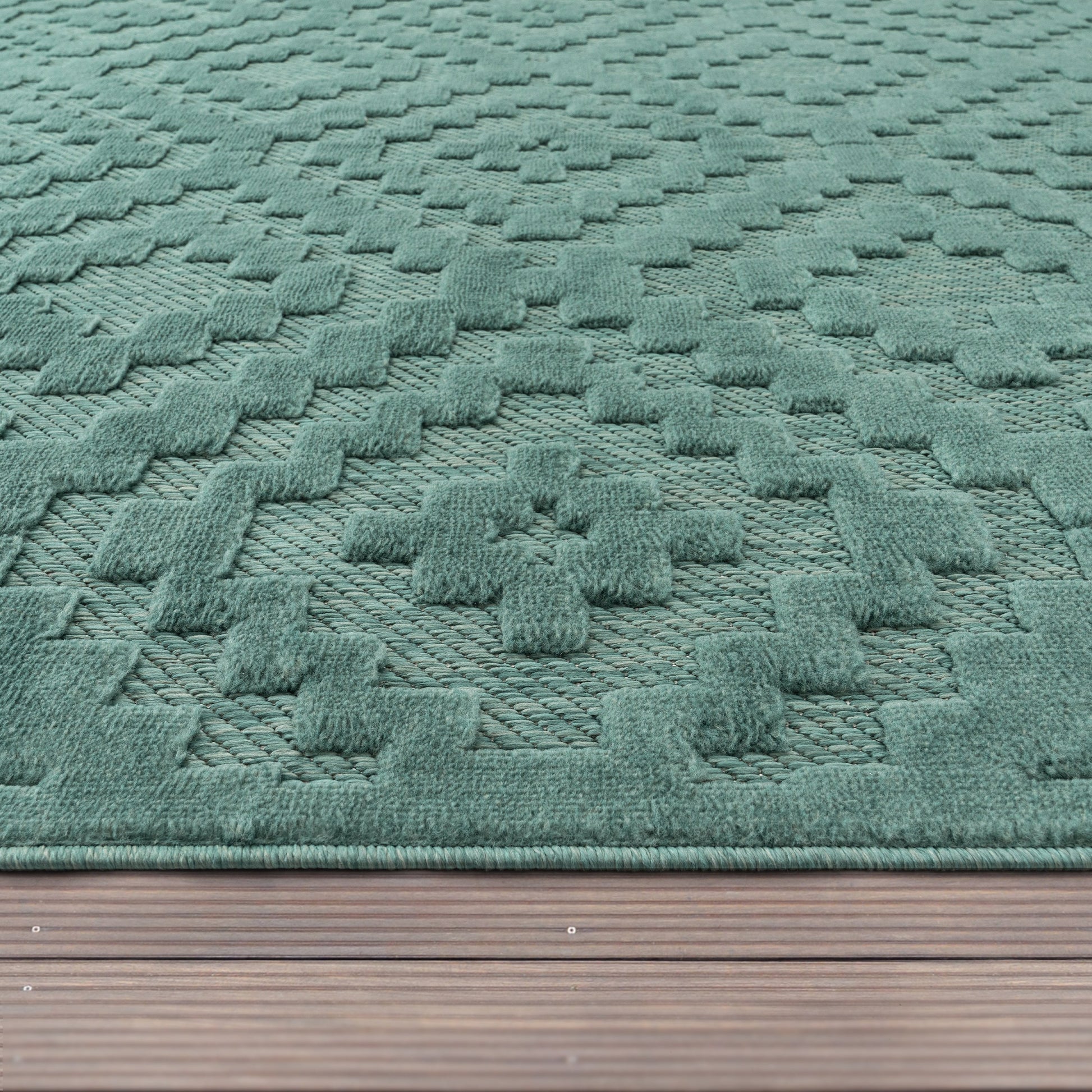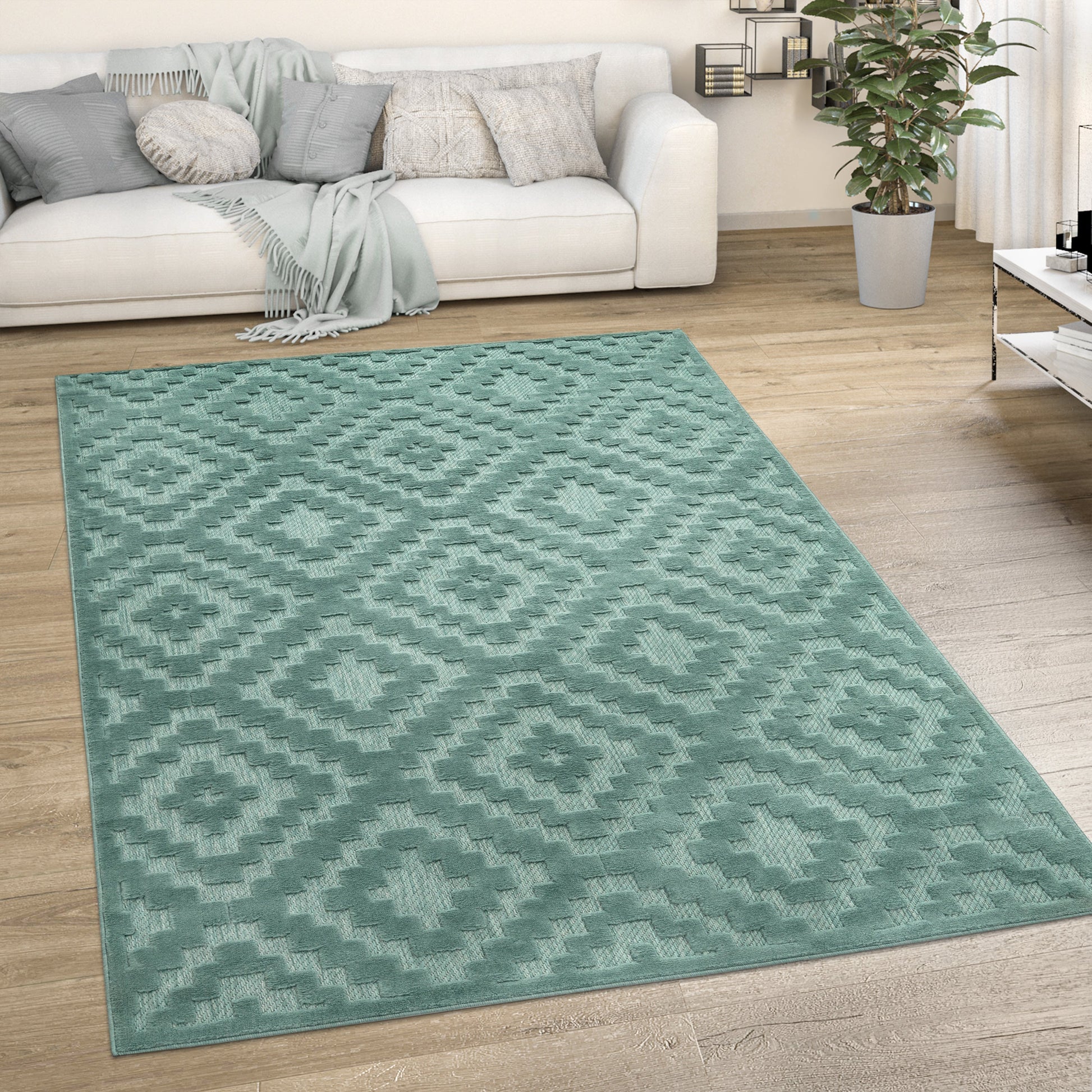 Indoor Outdoor Rug Livorno Trellis High-Low Pattern In Turquoise