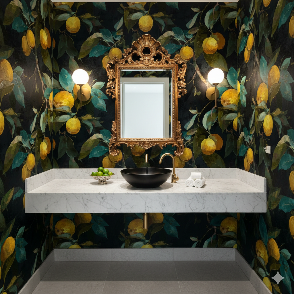 Branches heavy with lemons and oranges glow against a near-black background, their golden hues intensified by teal-green leaves and painterly brushwork. This wallpaper channels Mediterranean abundance, evoking citrus groves along coastal villas. Perfect for kitchens, dining rooms, or sun-soaked breakfast nooks, it brings brightness and life into spaces year-round. The dramatic contrast of dark backdrop and luminous fruit makes it bold and cheerful without sacrificing sophistication. It works equally well in a modern Italian-inspired kitchen or a maximalist eclectic living room.