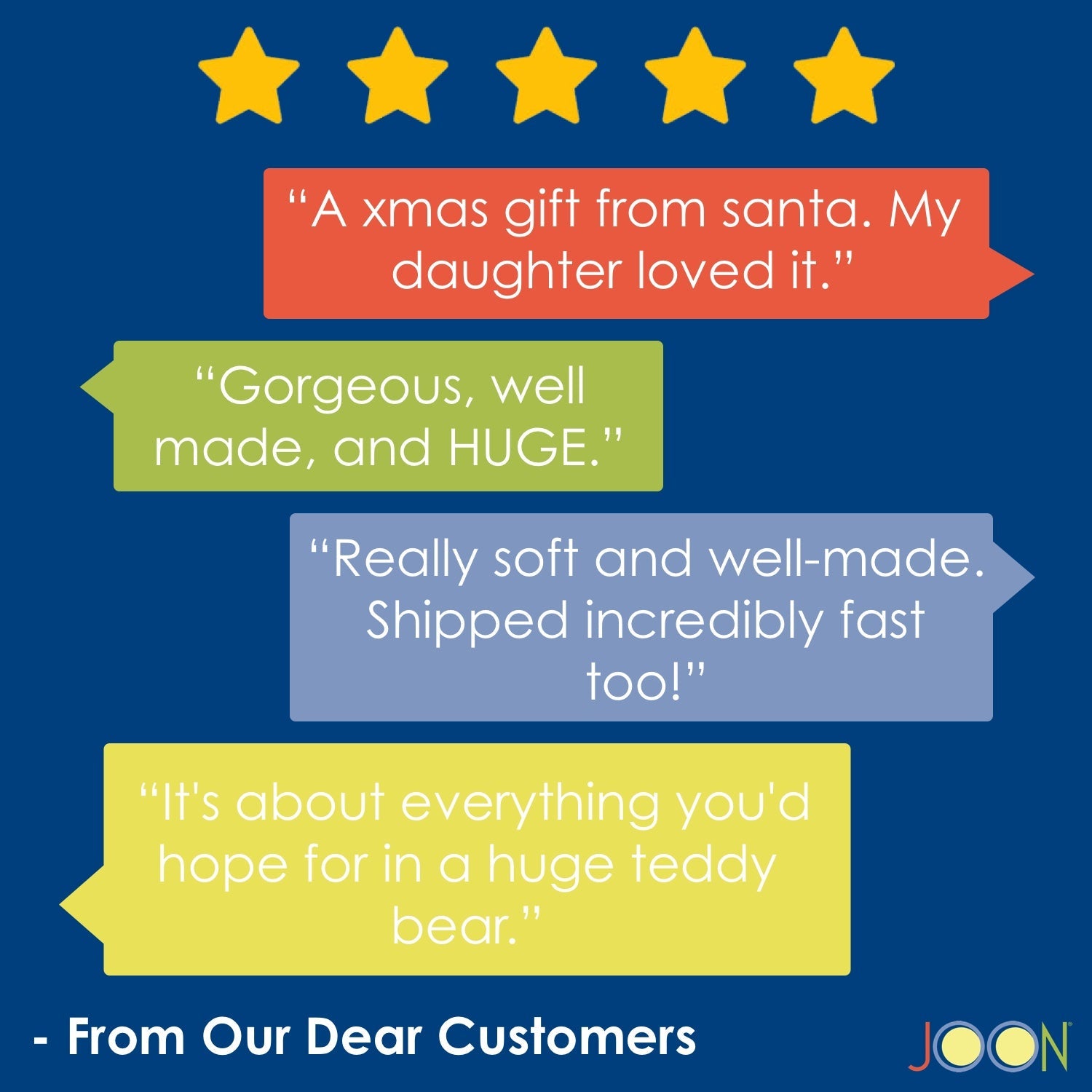 The Joon Super plush huge teddy bear now comes in pink. This beautiful bear will provide endless enjoyment for your young one. The Joon bear makes a wonderful gift for any new born baby girl or girlfriend. Measures approximately 38" Toes to Ears. The bear Measures approximately 24" sitting down.