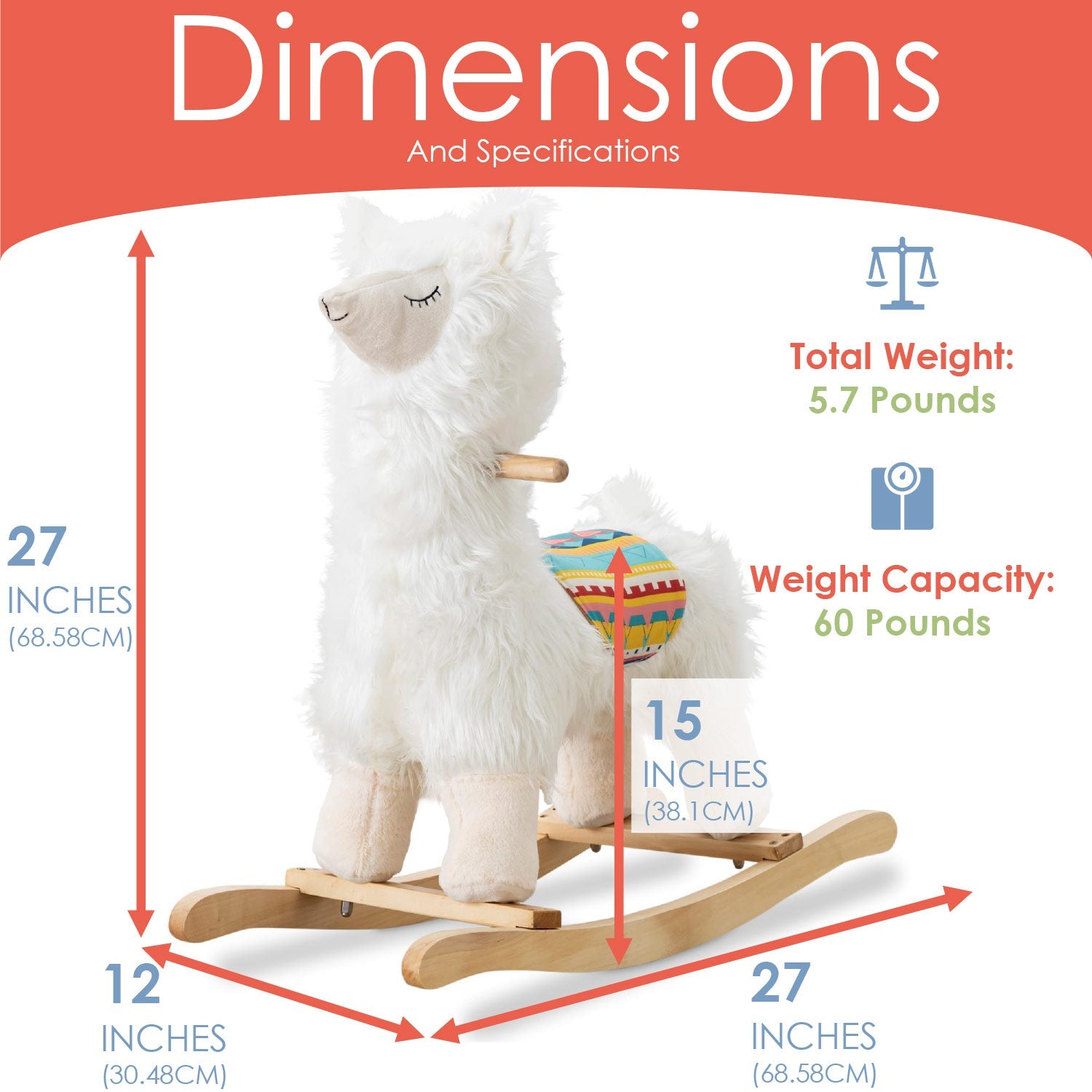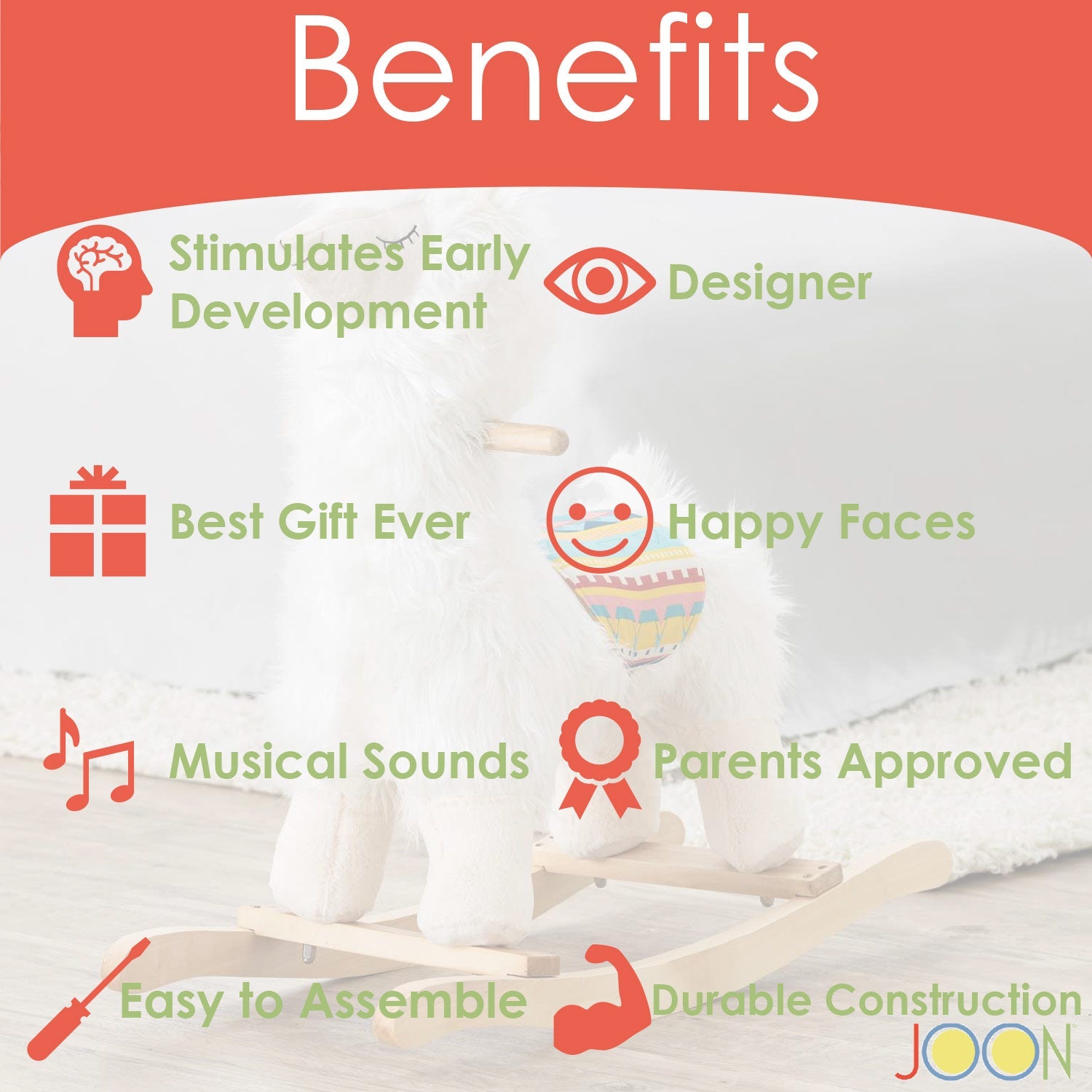 Lola the Llama Rocking Horse is eager for a new home and tired of sitting in the mountain tops of Peru! Saddle up and take a ride on this incredibly adorable llama. Featuring a super soft stuffed body with a shaggy fur, dreamy eyes and a colorful vintage south American saddle. JOON’s Ride-On Rocking Horse Llama will have your child riding for hours while helping them to develop key motor skills and balance, along with fueling their imagination and creativity. Lola the Rocking Llama is soft and plush to the touch, and made with sturdy wooden handles and rocker base to ensure the safety of your child. Details include embroidered dreamy eyes, removable saddle, shaggy faux fur, a cute little tail, and lullaby sounds with the push of a button. Whether it’s roaming the grasslands of Peru or grazing among livestock, the adventures will never end! Durable enough to hand down from child to child, this will be a favorite for years to come. Also features fun lullaby sound effects, 2 AA batteries required (not Included).CARE: When it’s time to clean your new rocking horse, spot clean with a damp cloth only. COLOR: White with multi-color saddle. WEIGHT CAPACITY: 66 Pounds.