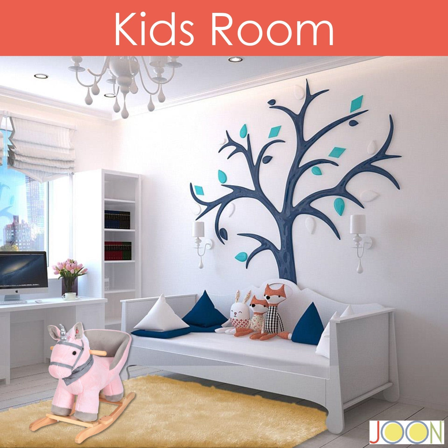 Sail by the enchanted stars and parades of clouds on a moonlit night with your new best friend, Luna; By JOON. The Luna Rocking Horse Unicorn With Scarf is a magical plush pony that sits on a beautiful wooden base. The super soft fur on this plush rocking horse is so cuddly to touch and hug. Featuring lovely large brown eyes and a white mane, she is geared up and ready to soar with a cute gray scarf and a soft cushioned seat for your child to tag along. The sturdy wooden handles will ensure a safe and secure ride. The cushioned seat cups your child to ensure they are in safe and secure. The JOON Unicorn Rocking Horse Pony needs two AA batteries (Not Included) to make sound effects for an even more exciting adventure. Squeeze her left ear and your child will be amazed! Let them take on their magical princess adventure, expanding their imagination and creativity. JOON Unicorn Rocking Horse Pony can take a rider who weighs up to 60 lbs. COLOR: Pink and grey with Silver Unicorn. WEIGHT CAPACITY: 60 Pounds. DIMENSIONS: 26.5 Length, 13 Inches Wide, 21.5 Inches Tall, and the Chair Height is 12 Inches from the ground. PRODUCT WEIGHT: 6.45 Pounds.