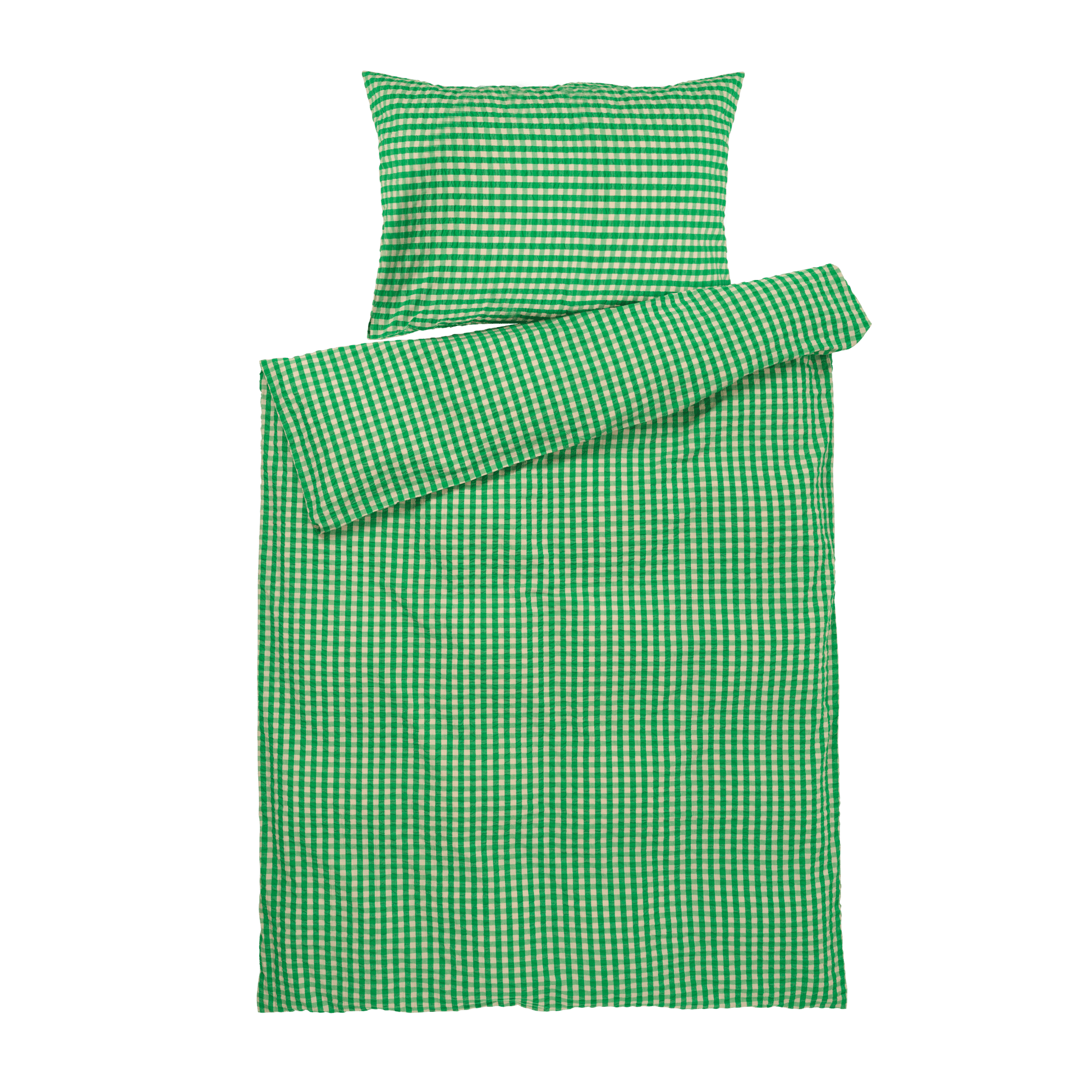 This set, in stylishly subdued green and sand gingham, is a classic, cool, and environmentally responsible addition to any bedroom.
