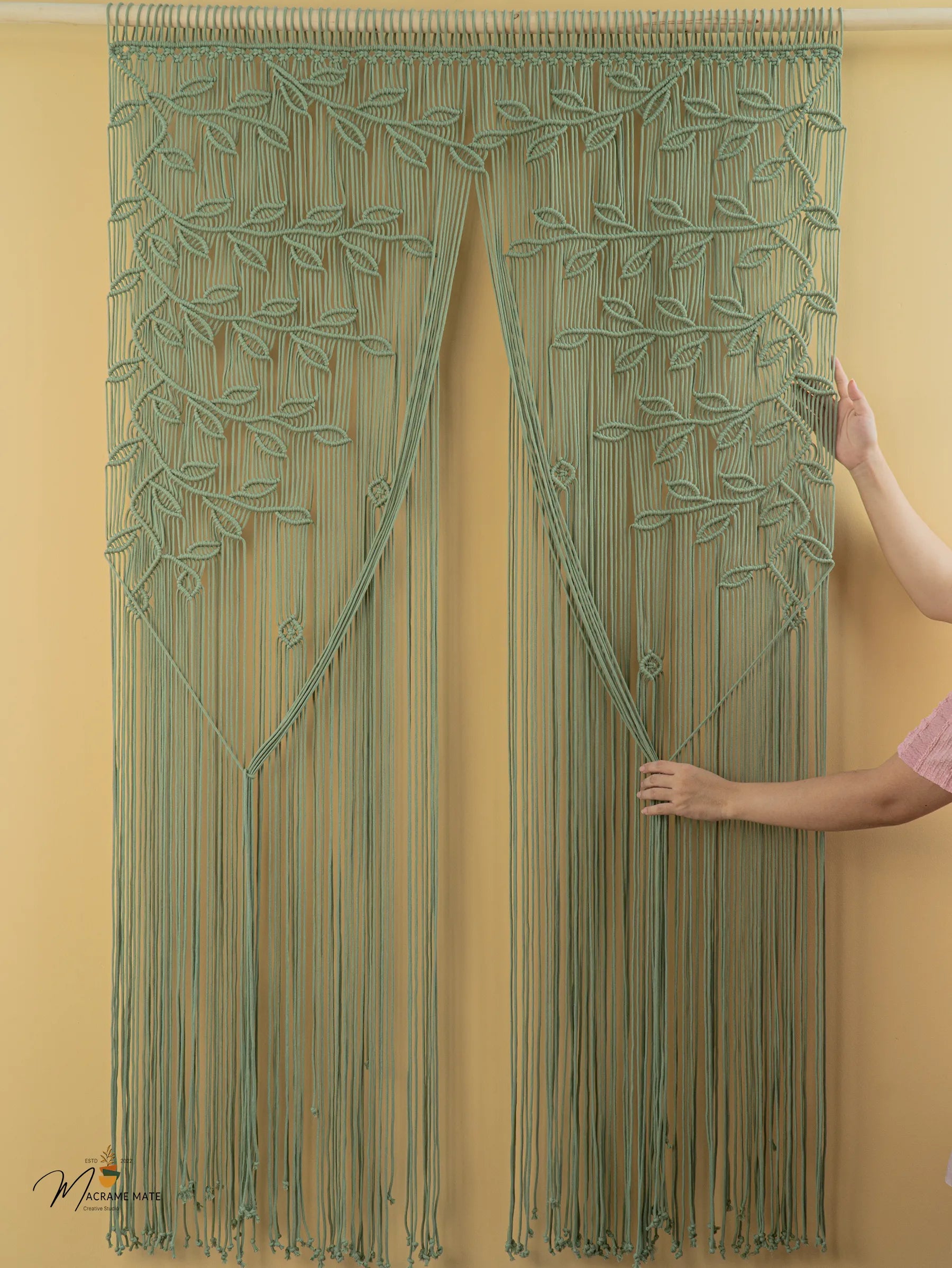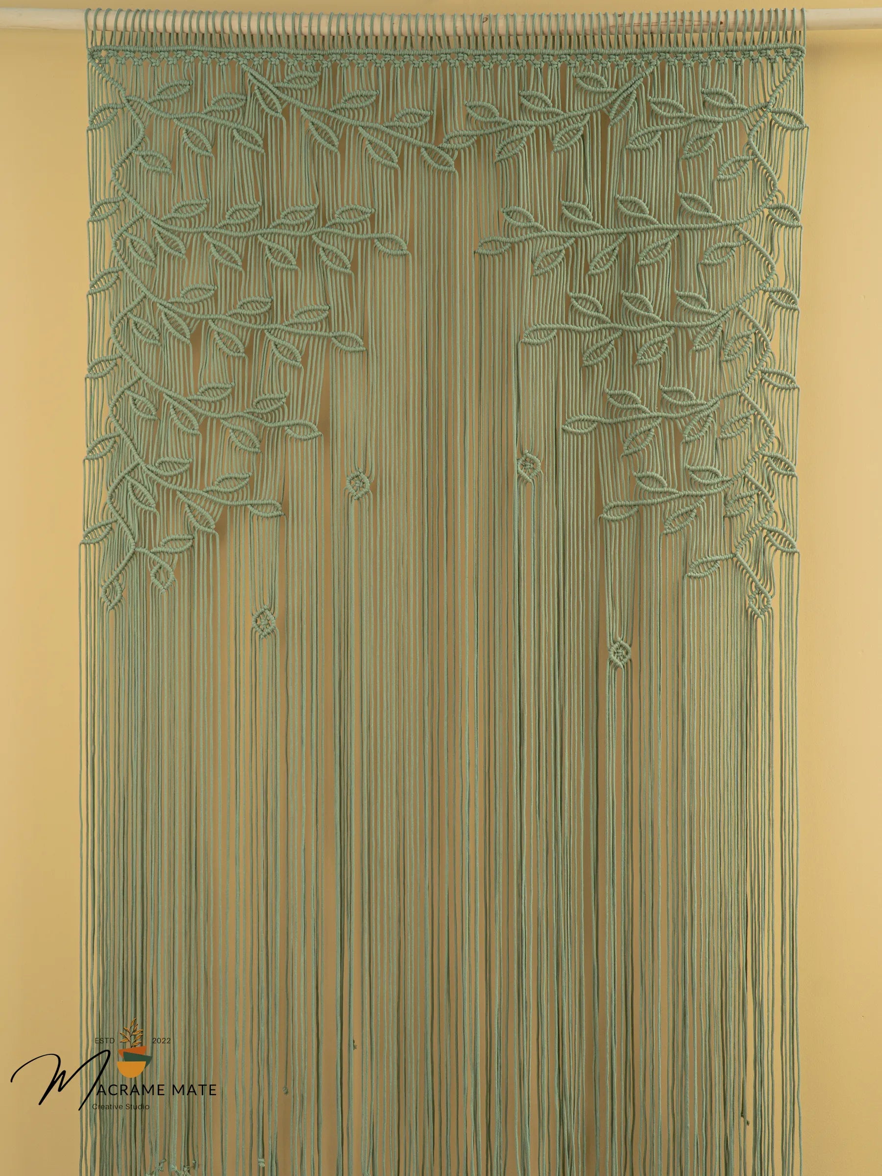 Infuse your space with serene, earthy charm using our Juno Sage Green Macrame Leaf Door Curtain. Expertly handcrafted from premium, eco-friendly cotton cords, this boho-inspired piece features delicate leaf patterns in a soothing sage green hue. Perfect for doorways, windows, or as an elegant room divider, it adds natural texture and a touch of organic elegance while softly diffusing light.