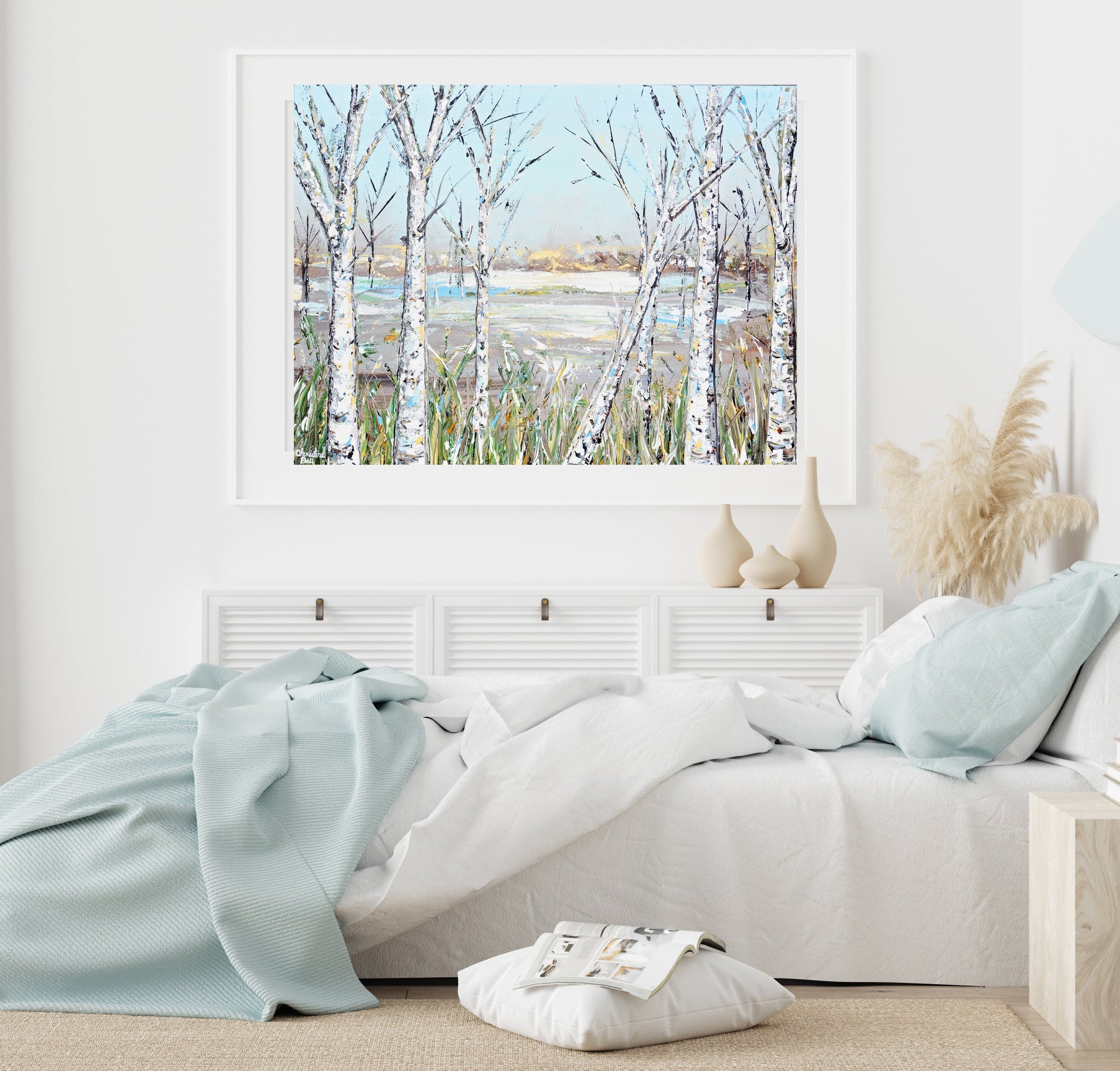 "Just Breathe" Giclee Print Art Abstract Landscape Painting Birch Trees Light Blue White
