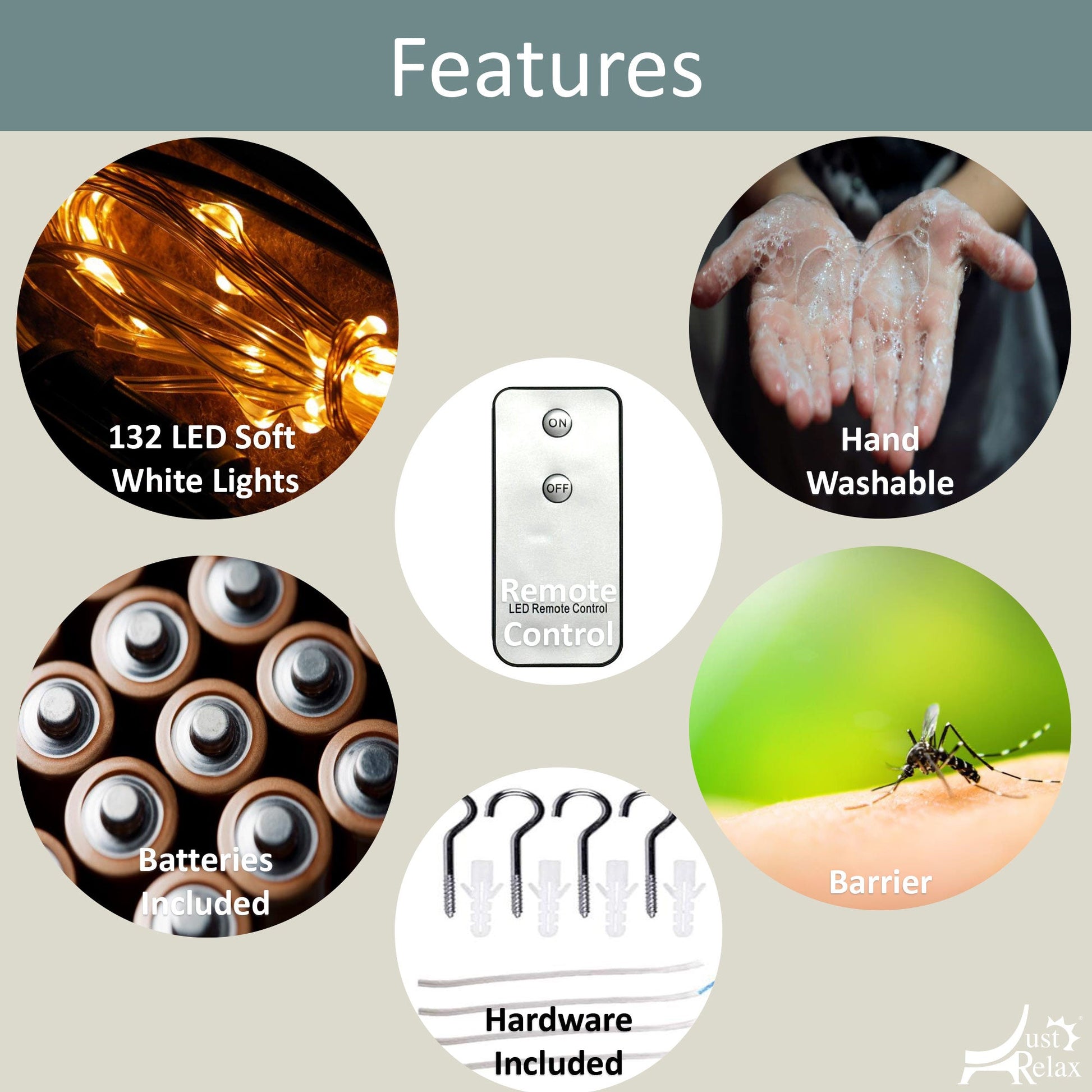 Featuring 132 Soft white LED lights and a convenient remote control, this bed canopy net adds a touch of elegance to your bedroom decor. The lights can easily be turned off or on with convenience of the wireless remote control making it the perfect accessory for any nighttime routine. Plus, with a continuous battery usage of 24-48 hours depending on the battery type and usage, you'll have plenty of time to relax and unwind without worrying about replacing batteries.