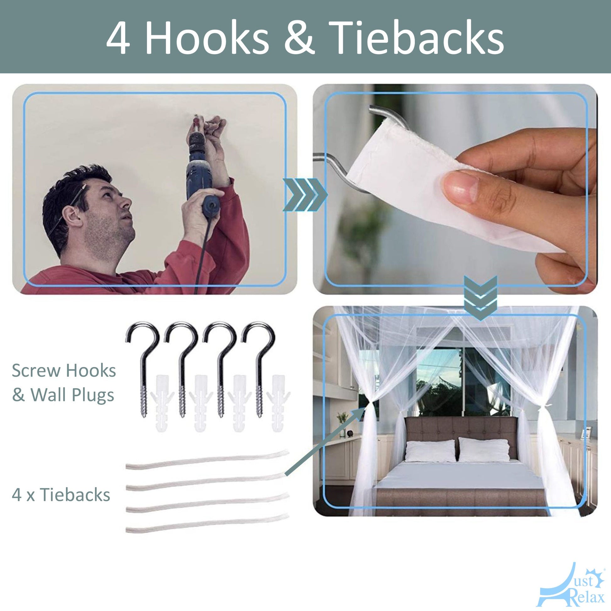 With its sleek design and functional features, the Just Relax Four Post Bed Canopy is a must-have for any bedroom. In addition to the bed canopy net, the package includes four tie-back ties for easy opening and closing. Transform your space into a palace with this stylish and practical accessory. 3 AA batteries and 1 CR2025 are included. PACKAGE CONTENTS: Bed Canopy, 3 Tiebacks, 4 Wall anchors, 4 Wall Hooks, Remote Control, 3 AA Battery, 1 CR2025 Battery. CARE: Hand Wash Only. Don’t iron, Air Dry, don’t use Bleach. DIMENSIONS: 86.6 l x78.7 W x 98.4 H Inches. COLOR: White