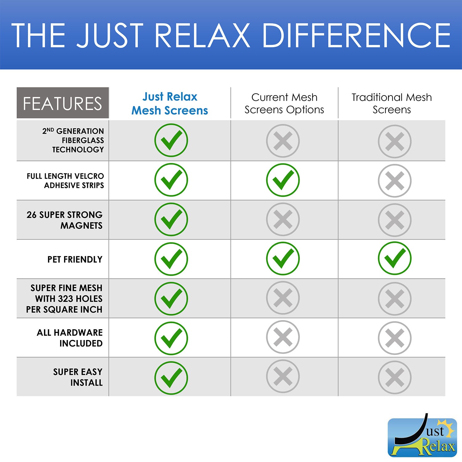 Stop worrying about little bugs and critters from getting into your spaces! Just Relax has the perfect solution for Protecting your family from the bites from pests and insects without restricting the fresh air from coming in! The Premium Magnetic Fiberglass Screen Door By Just Relax is perfect for you and your loved ones. Made with the latest in mesh screen Technology, this fiberglass screen door is safe for children and pets. Come and go as you please with the 26 super strong hidden magnets helps this screen door ensure a tight seal all the time. The convenient and hands free magnetic seal automatically closes behind you without you worrying about opening and closing the screen. Made with a premium superfine mesh screen with 323 holes per square inch fabric is not only lightweight but super durable and great for keeps all of the bugs out! Fiberglass mesh helps ventilate and distributes even air circulation while providing you with natural light. Just relax premium fiberglass mesh door screens are perfect for parties, back doors, patio doors, kitchen doors, even makes a great room divider inside your home. With all of the hardware included installing your new premium magnetic fiberglass screen door will be a breeze. Simply use the contents provided to ensure a strong and sturdy installation. CONTENTS: 1 Mesh Screen, 1 Set of Push Pin Nails, 1 Roll of Velcro, Setup Instructions included, and reusable plastic bag. Setup Time: approximately 5-7 Minutes. COLOR: Black. DIMENSIONS: Screen Door (36x83 Inches) Fits Door Size (34x82 Inches).